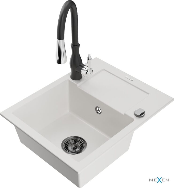 MEXEN/S MEXEN/S – Enzo granitový drez 1 s odkvapkávačom vrátane batérie Savita, biela 6506-20-672601-70