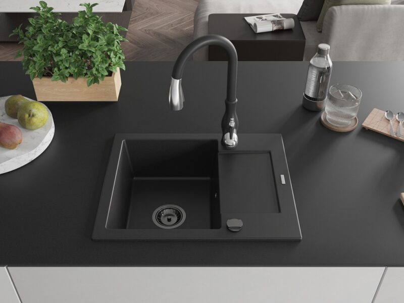 Technické dáta: drez: Rozmer: 576x465x174mm Hĺbka komory: 164 mm Rozmery komory: 395×320 mm Priemer odtoku: ø90 mm Typ: 1-miska s krátkym odkvapkávačom Typ: Zapustené do pracovnej dosky Čierna farba Povrchová úprava sifónu: čierna Materiál: žula (80% žulové kamenivo, 20% živice) Prepadový otvor: Áno Otvory: (batérie, automatické) 2 Inštalácia: Univerzálna, je možné inštalovať s odkvapkávačom na ľavú alebo pravú stranu Vysoká odolnosť proti poškriabaniu a zmene farby Odolnosť proti tepelným šokom Ľahko čistiteľný povrch Dva dodatočné vyfrézované otvory na samodierovanie ø35 kuchynská batéria: Materiál: mosadz Čierna farba Hlava: Keramická Prevzdušňovač: Áno Typ: Jedna páka Výška batérie: 410 mm Rozsah výtoku: 231 mm(GT) Ean: 5905315034151