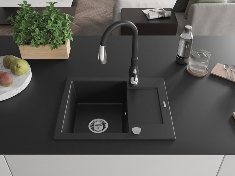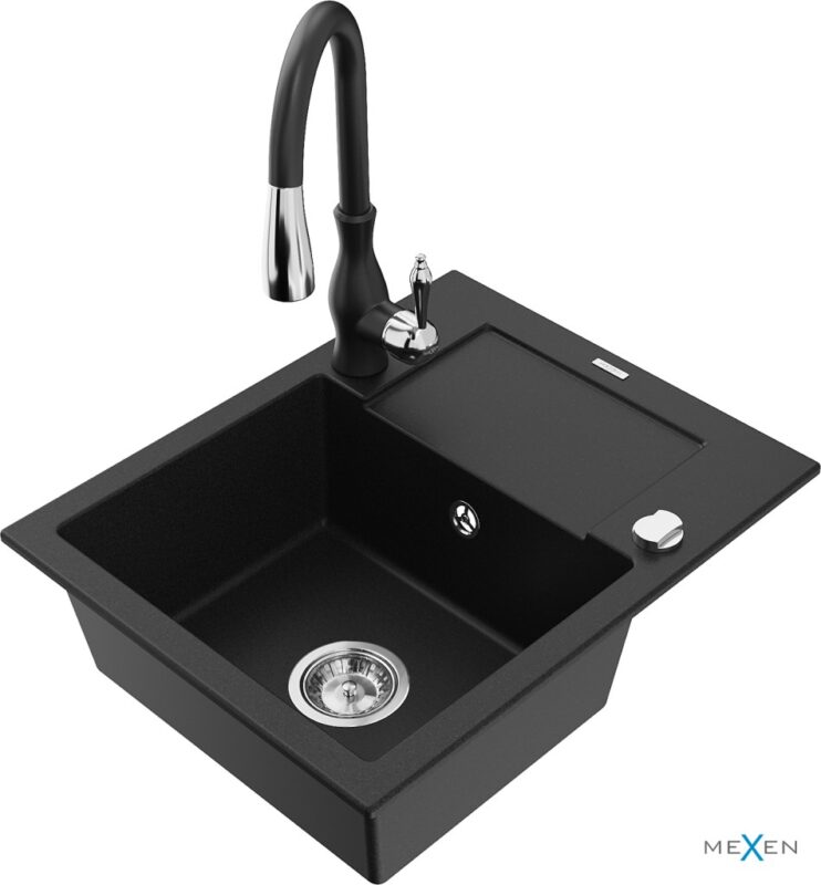 MEXEN/S MEXEN/S – Enzo granitový drez 1 s odkvapkávačom vrátane batérie Savita, čierna 6506-77-672601-70