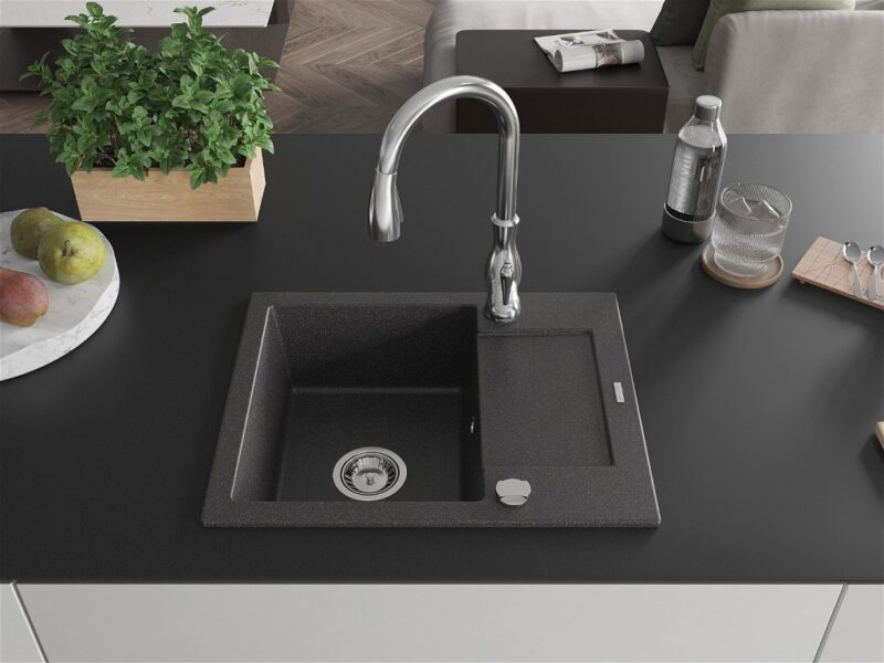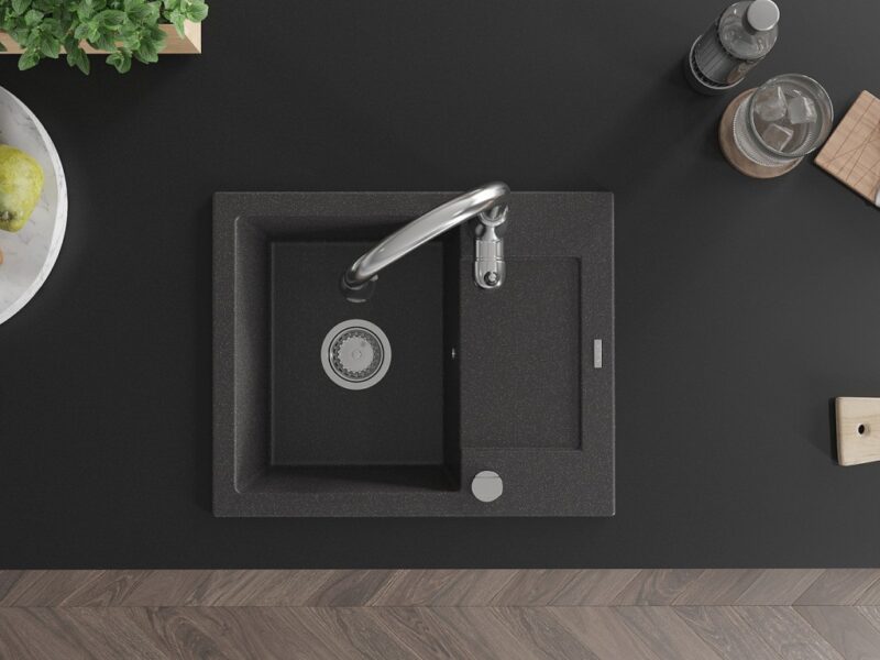 Technické dáta: drez: Rozmer: 576x465x174mm Hĺbka komory: 164 mm Rozmery komory: 395×320 mm Priemer odtoku: ø90 mm Typ: 1-miska s krátkym odkvapkávačom Typ: Zapustené do pracovnej dosky Farba: Škvrnitá čierna Povrchová úprava sifónu: Chrome Materiál: žula (80% žulové kamenivo, 20% živice) Prepadový otvor: Áno Otvory: (batérie, automatické) 2 Inštalácia: Univerzálna, je možné inštalovať s odkvapkávačom na ľavú alebo pravú stranu Vysoká odolnosť proti poškriabaniu a zmene farby Odolnosť proti tepelným šokom Ľahko čistiteľný povrch Dva dodatočné vyfrézované otvory na samodierovanie ø35 kuchynská batéria: Materiál: mosadz Farba: Chrome Hlava: Keramická Prevzdušňovač: Áno Typ: Jedna páka Výška batérie: 410 mm Rozsah výtoku: 231 mm(GT) Ean: 5905315034076