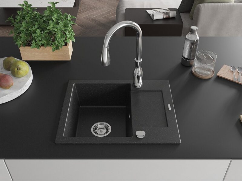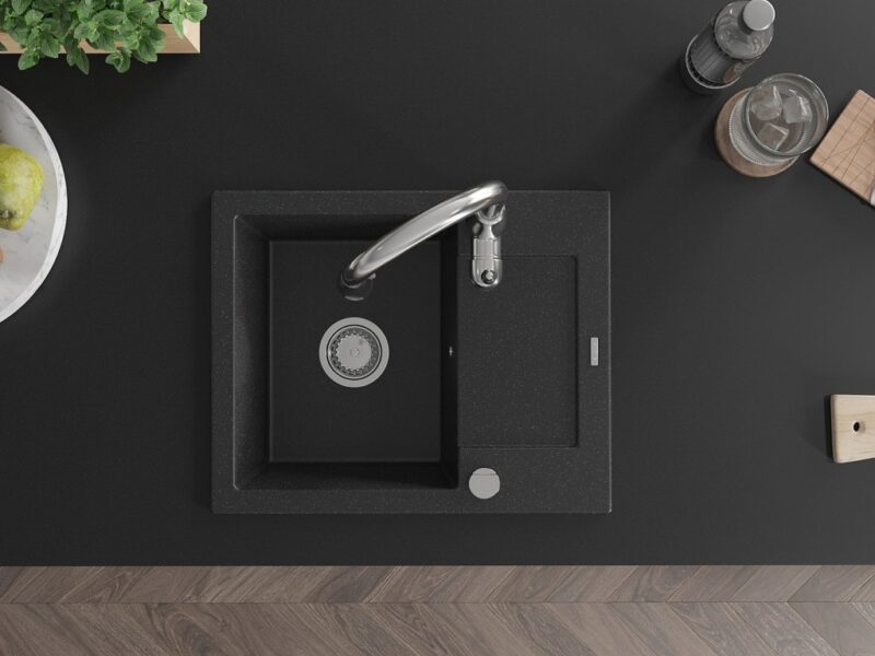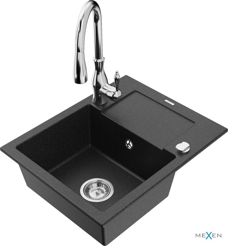 MEXEN/S MEXEN/S – Enzo granitový drez 1 s odkvapkávačom vrátane batérie Savita, čierna/strieborná metalík 6506-73-672601-00
