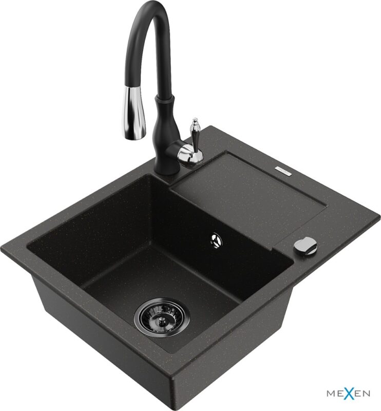 MEXEN/S MEXEN/S – Enzo granitový drez 1 s odkvapkávačom vrátane batérie Savita, čierna/zlatá metalik 6506-75-672601-70-B