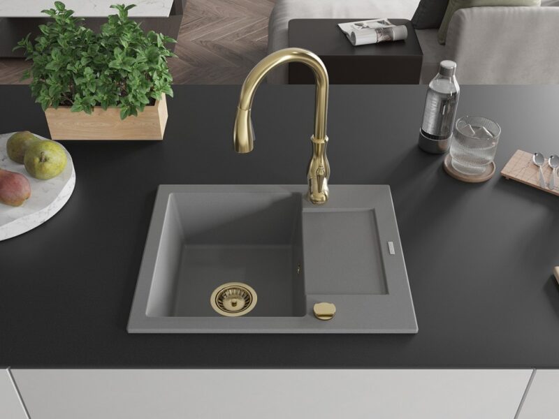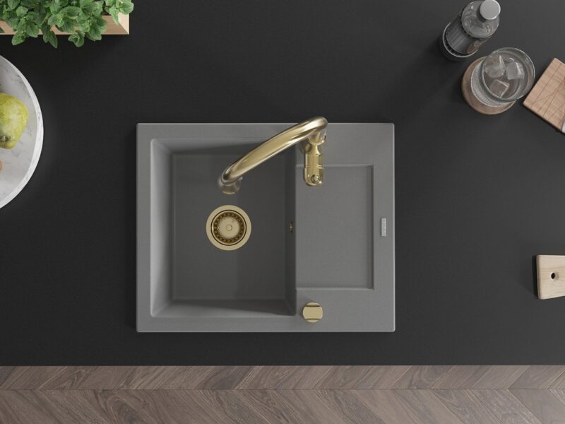 Technické dáta: drez: Rozmer: 576x465x174mm Hĺbka komory: 164 mm Rozmery komory: 395×320 mm Priemer odtoku: ø90 mm Typ: 1-miska s krátkym odkvapkávačom Typ: Zapustené do pracovnej dosky Šedá farba Povrchová úprava sifónu: zlatá Materiál: žula (80% žulové kamenivo, 20% živice) Prepadový otvor: Áno Otvory: (batérie, automatické) 2 Inštalácia: Univerzálna, je možné inštalovať s odkvapkávačom na ľavú alebo pravú stranu Vysoká odolnosť proti poškriabaniu a zmene farby Odolnosť proti tepelným šokom Ľahko čistiteľný povrch Dva dodatočné vyfrézované otvory na samodierovanie ø35 kuchynská batéria: Materiál: mosadz Farba: Zlatá Hlava: Keramická Prevzdušňovač: Áno Typ: Jedna páka Výška batérie: 410 mm Rozsah výtoku: 231 mm(GT) Ean: 5905315033949