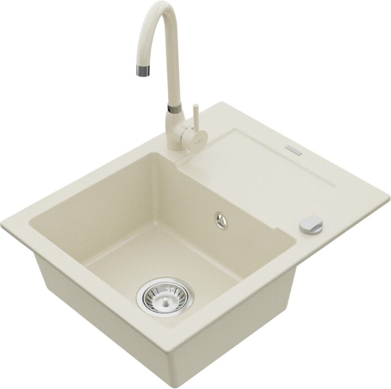 Technické dáta: drez: Rozmer: 576x465x174mm Hĺbka komory: 164 mm Rozmery komory: 395×320 mm Priemer odtoku: ø90 mm Typ: 1-miska s krátkym odkvapkávačom Typ: Zapustené do pracovnej dosky Farba béžová Povrchová úprava sifónu: Chrome Materiál: žula (80% žulové kamenivo, 20% živice) Prepadový otvor: Áno Otvory: (batérie, automatické) 2 Inštalácia: Univerzálna, je možné inštalovať s odkvapkávačom na ľavú alebo pravú stranu Vysoká odolnosť proti poškriabaniu a zmene farby Odolnosť proti tepelným šokom Ľahko čistiteľný povrch Dva dodatočné vyfrézované otvory na samodierovanie ø35 kuchynská batéria: Materiál: mosadz Farba béžová Hlava: Keramická Prevzdušňovač: Áno Výška batérie: 335 mm Rozsah výtoku: 180 mm(GT) Ean: 5907709189720