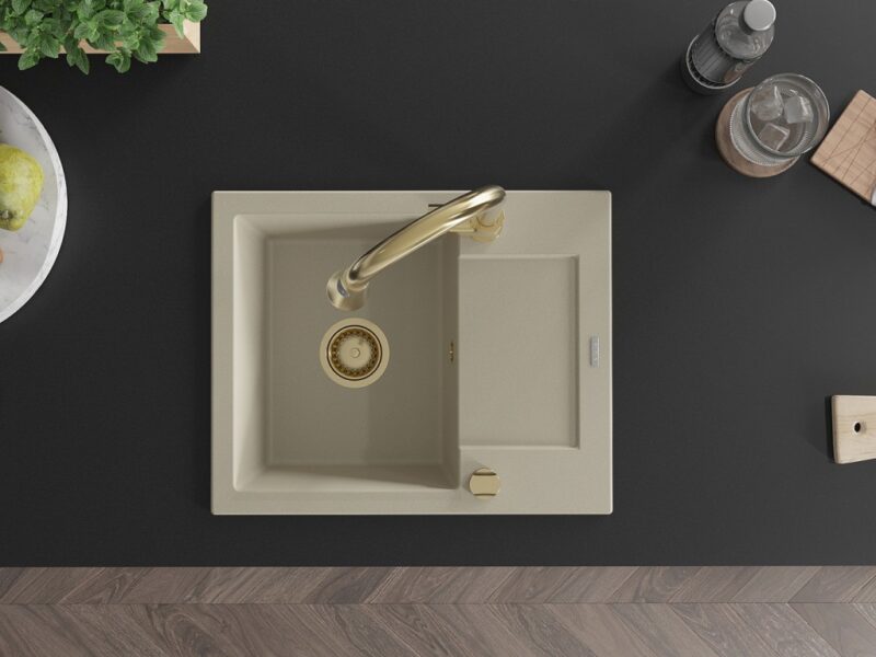 Technické dáta: drez: Rozmer: 576x465x174mm Hĺbka komory: 164 mm Rozmery komory: 395×320 mm Priemer odtoku: ø90 mm Typ: 1-miska s krátkym odkvapkávačom Typ: Zapustené do pracovnej dosky Farba béžová Povrchová úprava sifónu: zlatá Materiál: žula (80% žulové kamenivo, 20% živice) Prepadový otvor: Áno Otvory: (batérie, automatické) 2 Inštalácia: Univerzálna, je možné inštalovať s odkvapkávačom na ľavú alebo pravú stranu Vysoká odolnosť proti poškriabaniu a zmene farby Odolnosť proti tepelným šokom Ľahko čistiteľný povrch Dva dodatočné vyfrézované otvory na samodierovanie ø35 kuchynská batéria: Materiál: mosadz Farba: Zlatá Hlava: Keramická Prevzdušňovač: Áno Typ: Jedna páka Výška batérie: 380 mm Rozsah výtoku: 252 mm Typ výtoku: Výsuvný(GT) Ean: 5905315028792
