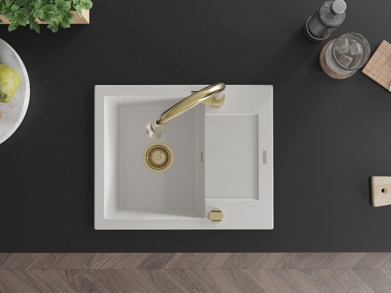 Technické dáta: drez: Rozmer: 576x465x174mm Hĺbka komory: 164 mm Rozmery komory: 395×320 mm Priemer odtoku: ø90 mm Typ: 1-miska s krátkym odkvapkávačom Typ: Zapustené do pracovnej dosky biela farba Povrchová úprava sifónu: zlatá Materiál: žula (80% žulové kamenivo, 20% živice) Prepadový otvor: Áno Otvory: (batérie, automatické) 2 Inštalácia: Univerzálna, je možné inštalovať s odkvapkávačom na ľavú alebo pravú stranu Vysoká odolnosť proti poškriabaniu a zmene farby Odolnosť proti tepelným šokom Ľahko čistiteľný povrch Dva dodatočné vyfrézované otvory na samodierovanie ø35 kuchynská batéria: Materiál: mosadz Farba: Zlatá Hlava: Keramická Prevzdušňovač: Áno Typ: Jedna páka Výška batérie: 380 mm Rozsah výtoku: 252 mm Typ výtoku: Výsuvný(GT) Ean: 5905315028754