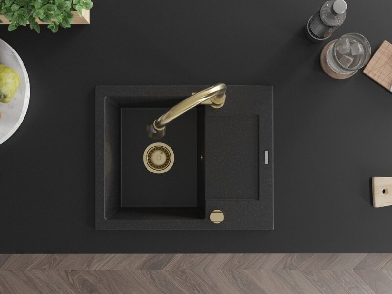 Technické dáta: drez: Rozmer: 576x465x174mm Hĺbka komory: 164 mm Rozmery komory: 395×320 mm Priemer odtoku: ø90 mm Typ: 1-miska s krátkym odkvapkávačom Typ: Zapustené do pracovnej dosky Farba: čierna/strieborná metalíza Povrchová úprava sifónu: zlatá Materiál: žula (80% žulové kamenivo, 20% živice) Prepadový otvor: Áno Otvory: (batérie, automatické) 2 Inštalácia: Univerzálna, je možné inštalovať s odkvapkávačom na ľavú alebo pravú stranu Vysoká odolnosť proti poškriabaniu a zmene farby Odolnosť proti tepelným šokom Ľahko čistiteľný povrch Dva dodatočné vyfrézované otvory na samodierovanie ø35 kuchynská batéria: Materiál: mosadz Farba: Zlatá Hlava: Keramická Prevzdušňovač: Áno Typ: Jedna páka Výška batérie: 380 mm Rozsah výtoku: 252 mm Typ výtoku: Výsuvný(GT) Ean: 5905315028877