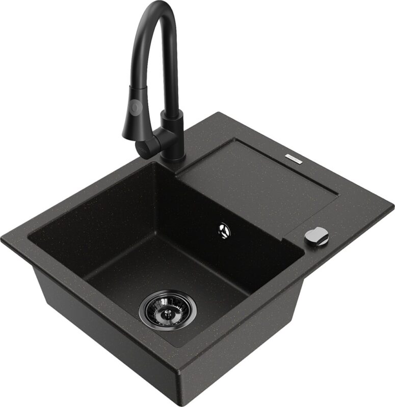Technické dáta: drez: Rozmer: 576x465x174mm Hĺbka komory: 164 mm Rozmery komory: 395×320 mm Priemer odtoku: ø90 mm Typ: 1-miska s krátkym odkvapkávačom Typ: Zapustené do pracovnej dosky Farba: čierna / zlatá metalíza Povrchová úprava sifónu: čierna Materiál: žula (80% žulové kamenivo, 20% živice) Prepadový otvor: Áno Otvory: (batérie, automatické) 2 Inštalácia: Univerzálna, je možné inštalovať s odkvapkávačom na ľavú alebo pravú stranu Vysoká odolnosť proti poškriabaniu a zmene farby Odolnosť proti tepelným šokom Ľahko čistiteľný povrch Dva dodatočné vyfrézované otvory na samodierovanie ø35 kuchynská batéria: Materiál: mosadz Čierna farba Hlava: Keramická Prevzdušňovač: Áno Typ: Jedna páka Výška batérie: 380 mm Rozsah výtoku: 252 mm Typ výtoku: Výsuvný(GT) Ean: 5905315028938