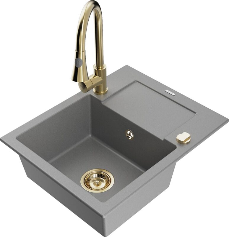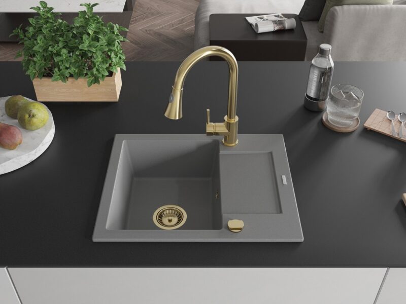 Technické dáta: drez: Rozmer: 576x465x174mm Hĺbka komory: 164 mm Rozmery komory: 395×320 mm Priemer odtoku: ø90 mm Typ: 1-miska s krátkym odkvapkávačom Typ: Zapustené do pracovnej dosky Šedá farba Povrchová úprava sifónu: zlatá Materiál: žula (80% žulové kamenivo, 20% živice) Prepadový otvor: Áno Otvory: (batérie, automatické) 2 Inštalácia: Univerzálna, je možné inštalovať s odkvapkávačom na ľavú alebo pravú stranu Vysoká odolnosť proti poškriabaniu a zmene farby Odolnosť proti tepelným šokom Ľahko čistiteľný povrch Dva dodatočné vyfrézované otvory na samodierovanie ø35 kuchynská batéria: Materiál: mosadz Farba: Zlatá Hlava: Keramická Prevzdušňovač: Áno Typ: Jedna páka Výška batérie: 380 mm Rozsah výtoku: 252 mm Typ výtoku: Výsuvný(GT) Ean: 5905315028822