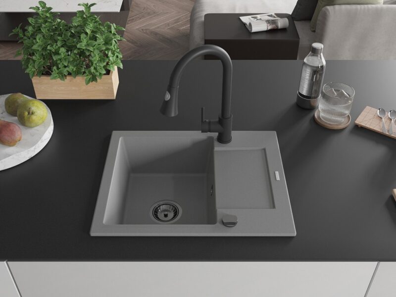 Technické dáta: drez: Rozmer: 576x465x174mm Hĺbka komory: 164 mm Rozmery komory: 395×320 mm Priemer odtoku: ø90 mm Typ: 1-miska s krátkym odkvapkávačom Typ: Zapustené do pracovnej dosky Šedá farba Povrchová úprava sifónu: čierna Materiál: žula (80% žulové kamenivo, 20% živice) Prepadový otvor: Áno Otvory: (batérie, automatické) 2 Inštalácia: Univerzálna, je možné inštalovať s odkvapkávačom na ľavú alebo pravú stranu Vysoká odolnosť proti poškriabaniu a zmene farby Odolnosť proti tepelným šokom Ľahko čistiteľný povrch Dva dodatočné vyfrézované otvory na samodierovanie ø35 kuchynská batéria: Materiál: mosadz Čierna farba Hlava: Keramická Prevzdušňovač: Áno Typ: Jedna páka Výška batérie: 380 mm Rozsah výtoku: 252 mm Typ výtoku: Výsuvný(GT) Ean: 5905315028846