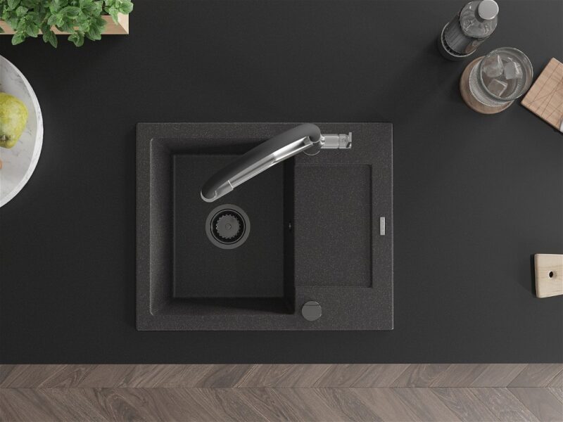 Technické dáta: drez: Rozmer: 576x465x174mm Hĺbka komory: 164 mm Rozmery komory: 395×320 mm Priemer odtoku: ø90 mm Typ: 1-miska s krátkym odkvapkávačom Typ: Zapustené do pracovnej dosky Farba: Škvrnitá čierna Povrchová úprava sifónu: čierna Materiál: žula (80% žulové kamenivo, 20% živice) Prepadový otvor: Áno Otvory: (batérie, automatické) 2 Inštalácia: Univerzálna, je možné inštalovať s odkvapkávačom na ľavú alebo pravú stranu Vysoká odolnosť proti poškriabaniu a zmene farby Odolnosť proti tepelným šokom Ľahko čistiteľný povrch Dva dodatočné vyfrézované otvory na samodierovanie ø35 kuchynská batéria: Materiál: mosadz Farba: chróm/čierna Hlavy: Keramické Prevzdušňovač: Áno Typ hubica: Flexibilný s mosadzným držiakom Rozsah výtoku: 260 mm Výška: 405 mm Typ: Dve rukoväte Dvojhlavá batéria s prídavným filtrom na pitnú vodu(GT) Ean: 5905315100351