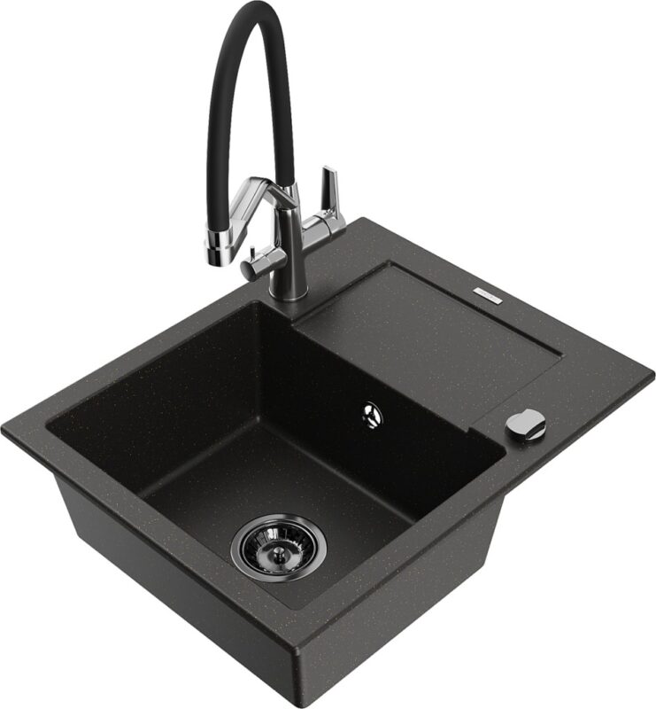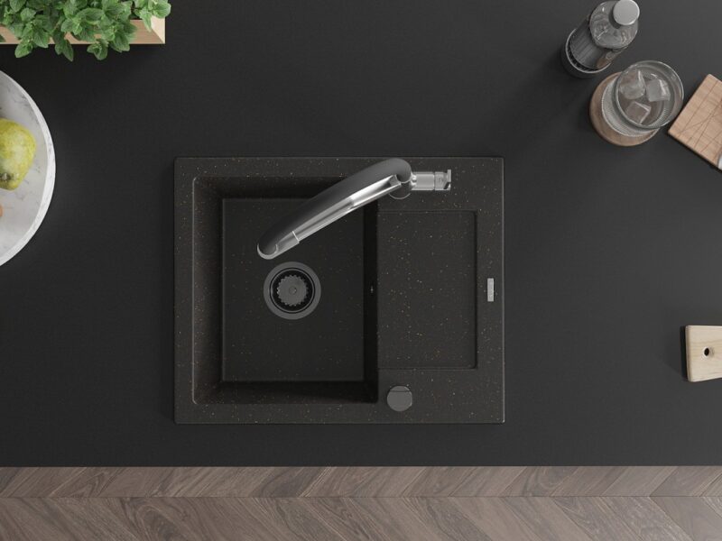 Technické dáta: drez: Rozmer: 576x465x174mm Hĺbka komory: 164 mm Rozmery komory: 395×320 mm Priemer odtoku: ø90 mm Typ: 1-miska s krátkym odkvapkávačom Typ: Zapustené do pracovnej dosky Farba: čierna / zlatá metalíza Povrchová úprava sifónu: čierna Materiál: žula (80% žulové kamenivo, 20% živice) Prepadový otvor: Áno Otvory: (batérie, automatické) 2 Inštalácia: Univerzálna, je možné inštalovať s odkvapkávačom na ľavú alebo pravú stranu Vysoká odolnosť proti poškriabaniu a zmene farby Odolnosť proti tepelným šokom Ľahko čistiteľný povrch Dva dodatočné vyfrézované otvory na samodierovanie ø35 kuchynská batéria: Materiál: mosadz Farba: chróm/čierna Hlavy: Keramické Prevzdušňovač: Áno Typ hubica: Flexibilný s mosadzným držiakom Rozsah výtoku: 260 mm Výška: 405 mm Typ: Dve rukoväte Dvojhlavá batéria s prídavným filtrom na pitnú vodu(GT) Ean: 5905315100306