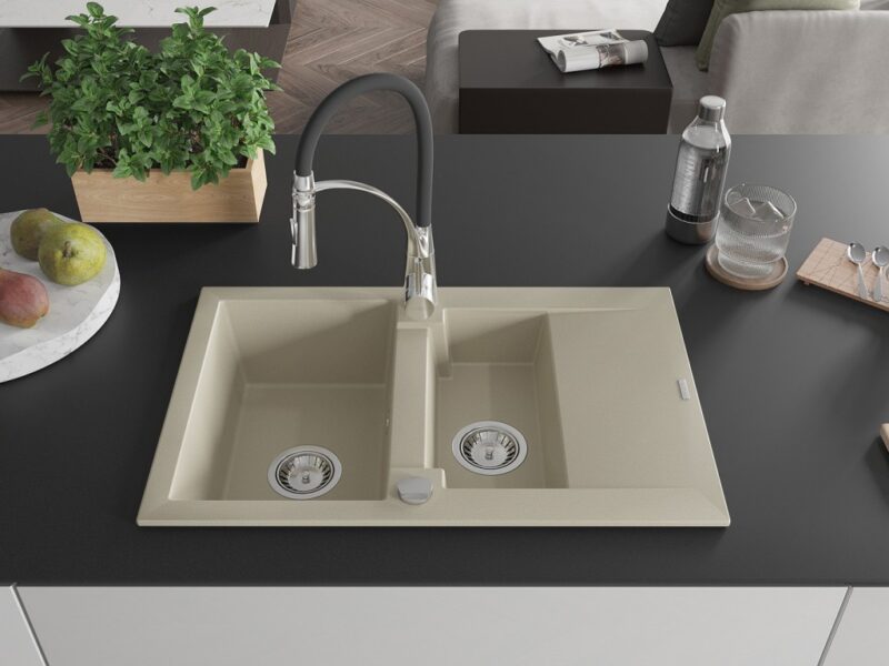 Technické dáta: Drez: Rozmer: 737x475x177 mm Hĺbka komory: 167 mm (väčšia), 107 mm (menšia) Rozmery komory: 395×272 mm (väčšie), (menšie) 375×182 mm Priemer odtoku: ø90 mm Typ: 1,5-miska s krátkym odkvapkávačom Typ: Zapustené do pracovnej dosky Farba béžová Povrchová úprava sifónu: Chrome Materiál: žula (80% žulové kamenivo 20% živice) Prepadový otvor: Áno Otvory: (batérie, automat) 2 Inštalácia: Univerzálna, je možné inštalovať s odkvapkávačom na ľavú alebo pravú stranu Vysoká odolnosť proti poškriabaniu a zmene farby Odolnosť proti tepelným šokom Povrch pre ľahké čistenie Kuchynská batéria: Materiál: mosadz Farba: chróm/čierna Hlava: Keramická Perlátor: Áno Typ výtoku: Flexibilný s mosadznou podperou Typ: Jednopákové Výška batérie: 430 mm Rozsah výtoku: 235 mm(GT) Ean: 5905315045102