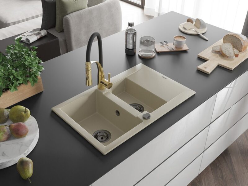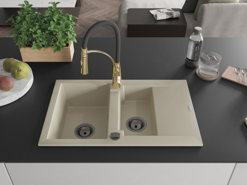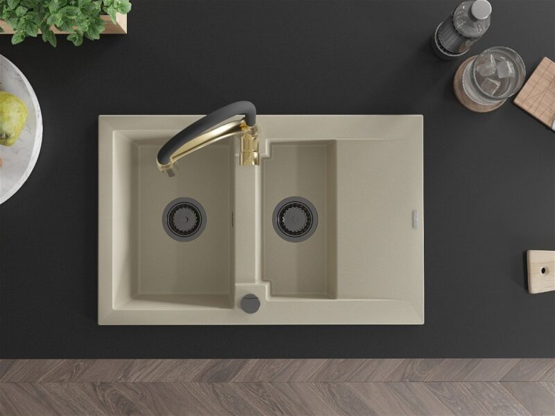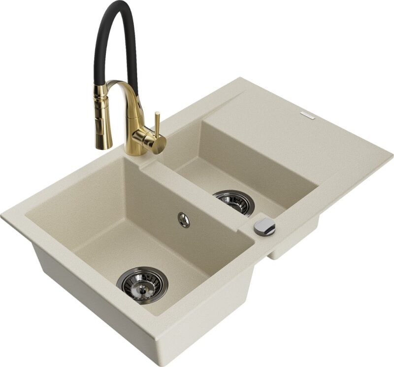 Technické dáta: Drez: Rozmer: 737x475x177 mm Hĺbka komory: 167 mm (väčšia), 107 mm (menšia) Rozmery komory: 395×272 mm (väčšie), (menšie) 375×182 mm Priemer odtoku: ø90 mm Typ: 1,5-miska s krátkym odkvapkávačom Typ: Zapustené do pracovnej dosky Farba béžová Povrchová úprava sifónu: čierna Materiál: žula (80% žulové kamenivo 20% živice) Prepadový otvor: Áno Otvory: (batérie, automat) 2 Inštalácia: Univerzálna, je možné inštalovať s odkvapkávačom na ľavú alebo pravú stranu Vysoká odolnosť proti poškriabaniu a zmene farby Odolnosť proti tepelným šokom Povrch pre ľahké čistenie Kuchynská batéria: Materiál: mosadz Farba: Zlatá/Čierna Hlava: Keramická Perlátor: Áno Typ výtoku: Flexibilný s mosadznou podperou Typ: Jednopákové Výška batérie: 430 mm Rozsah výtoku: 235 mm(GT) Ean: 5905315045133