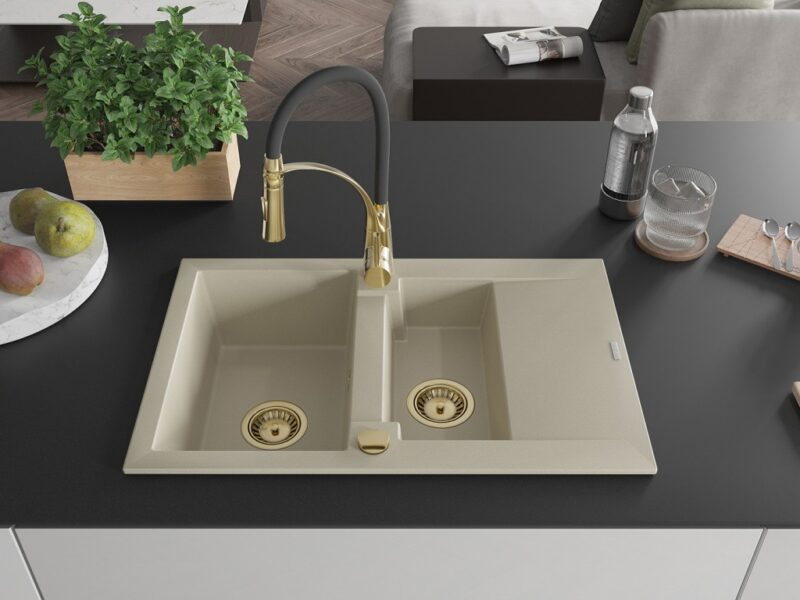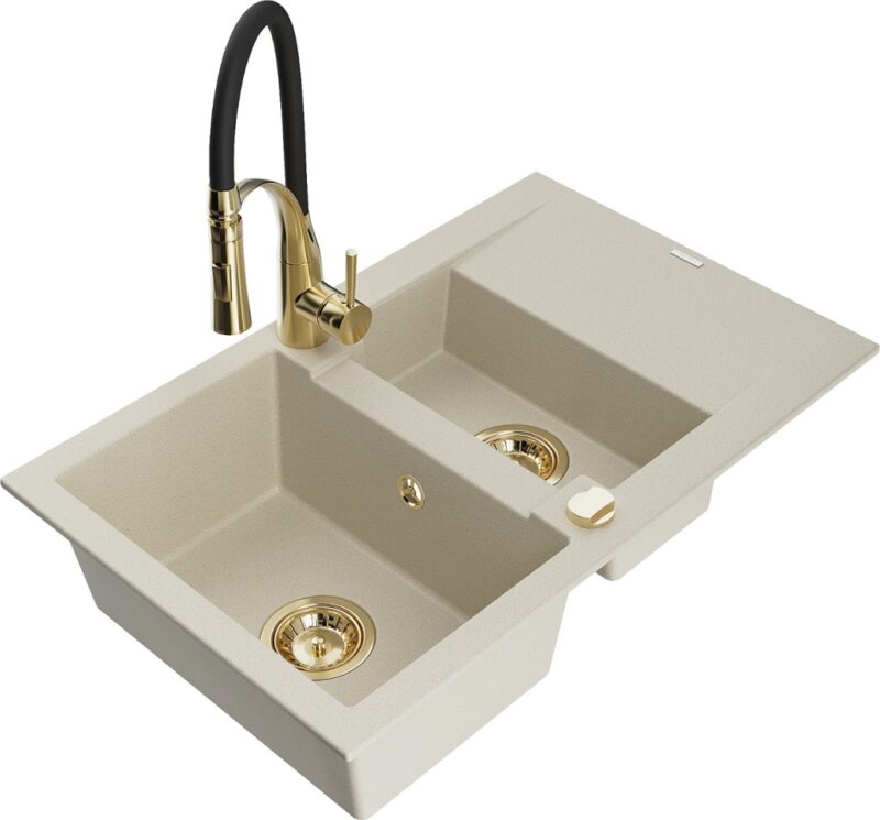 Technické dáta: Drez: Rozmer: 737x475x177 mm Hĺbka komory: 167 mm (väčšia), 107 mm (menšia) Rozmery komory: 395×272 mm (väčšie), (menšie) 375×182 mm Priemer odtoku: ø90 mm Typ: 1,5-miska s krátkym odkvapkávačom Typ: Zapustené do pracovnej dosky Farba béžová Povrchová úprava sifónu: zlatá Materiál: žula (80% žulové kamenivo 20% živice) Prepadový otvor: Áno Otvory: (batérie, automat) 2 Inštalácia: Univerzálna, je možné inštalovať s odkvapkávačom na ľavú alebo pravú stranu Vysoká odolnosť proti poškriabaniu a zmene farby Odolnosť proti tepelným šokom Povrch pre ľahké čistenie Kuchynská batéria: Materiál: mosadz Farba: Zlatá/Čierna Hlava: Keramická Perlátor: Áno Typ výtoku: Flexibilný s mosadzným držiakom Typ: Jednopákové Výška batérie: 430 mm Rozsah výtoku: 235 mm(GT) Ean: 5905315045126