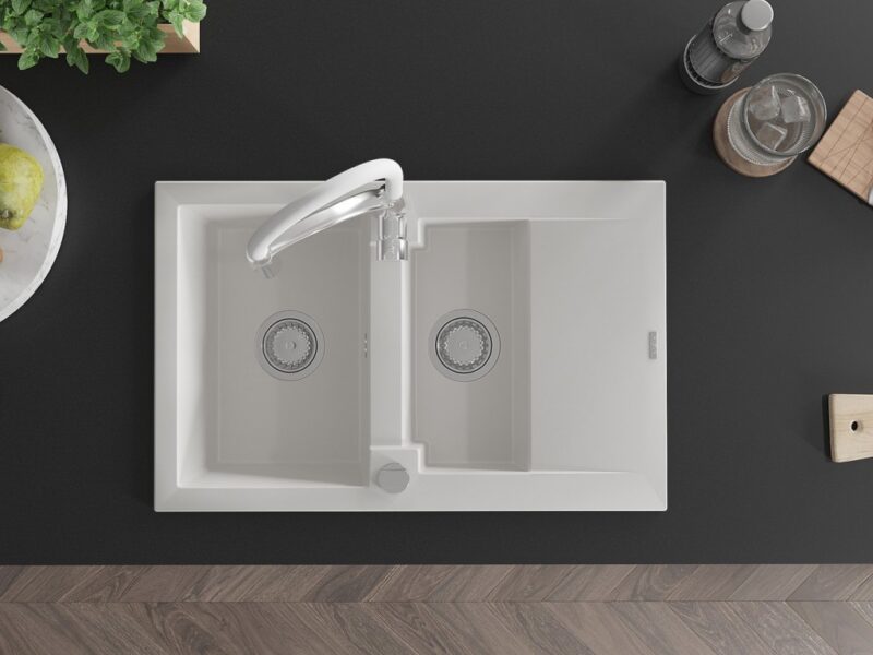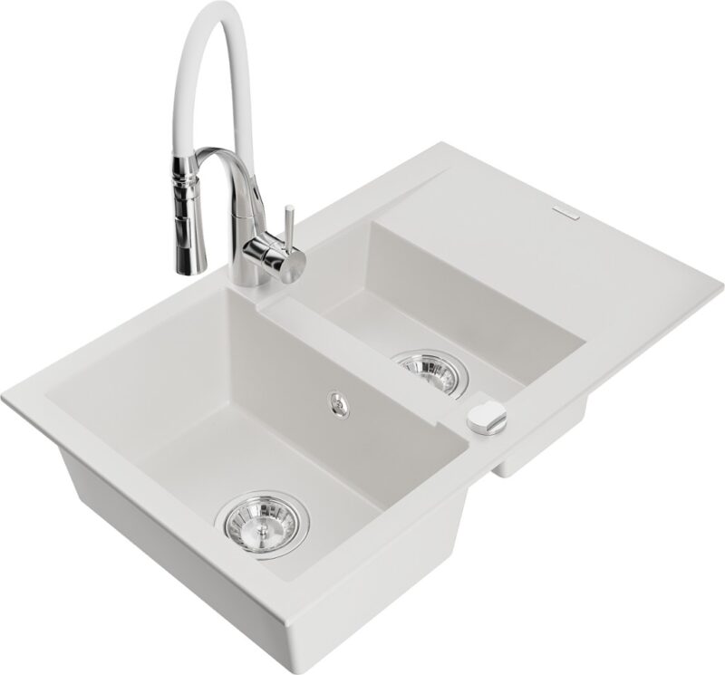 Technické dáta: drez: Rozmer: 737x475x177mm Hĺbka komory: 167 mm (väčšia), 107 mm (menšia) Rozmery komory: 395×272 mm (väčšie), (menšie) 375×182 mm Priemer odtoku: ø90 mm Typ: 1,5-miska s krátkym odkvapkávačom Typ: Zapustené do pracovnej dosky biela farba Povrchová úprava sifónu: Chrome Materiál: žula (80% žulové kamenivo, 20% živice) Prepadový otvor: Áno Otvory: (batérie, automatické) 2 Inštalácia: Univerzálna, je možné inštalovať s odkvapkávačom na ľavú alebo pravú stranu Vysoká odolnosť proti poškriabaniu a zmene farby Odolnosť proti tepelným šokom Ľahko čistiteľný povrch kuchynská batéria: Materiál: mosadz Farba: chróm/biela Hlava: Keramická Prevzdušňovač: Áno Typ hubica: Flexibilný s mosadzným držiakom Typ: Jedna páka Výška batérie: 430 mm Rozsah výtoku: 235 mm(GT) Ean: 5905315045034