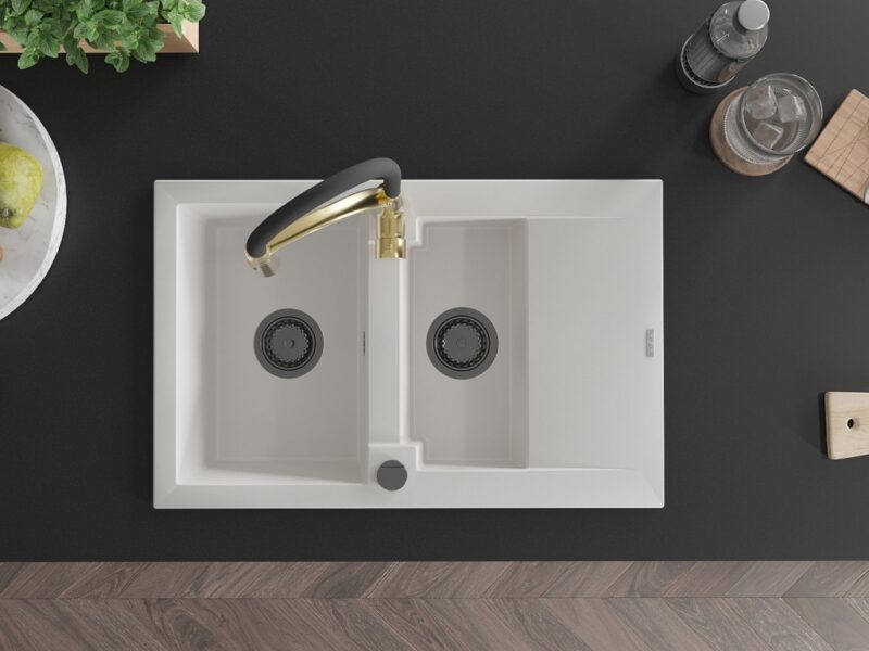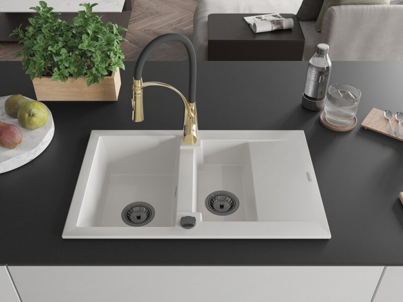 Technické dáta: drez: Rozmer: 737x475x177mm Hĺbka komory: 167 mm (väčšia), 107 mm (menšia) Rozmery komory: 395×272 mm (väčšie), (menšie) 375×182 mm Priemer odtoku: ø90 mm Typ: 1,5-miska s krátkym odkvapkávačom Typ: Zapustené do pracovnej dosky biela farba Povrchová úprava sifónu: čierna Materiál: žula (80% žulové kamenivo, 20% živice) Prepadový otvor: Áno Otvory: (batérie, automatické) 2 Inštalácia: Univerzálna, je možné inštalovať s odkvapkávačom na ľavú alebo pravú stranu Vysoká odolnosť proti poškriabaniu a zmene farby Odolnosť proti tepelným šokom Ľahko čistiteľný povrch kuchynská batéria: Materiál: mosadz Farba: Zlatá/Čierna Hlava: Keramická Prevzdušňovač: Áno Typ hubica: Flexibilný s mosadzným držiakom Typ: Jedna páka Výška batérie: 430 mm Rozsah výtoku: 235 mm(GT) Ean: 5905315045072