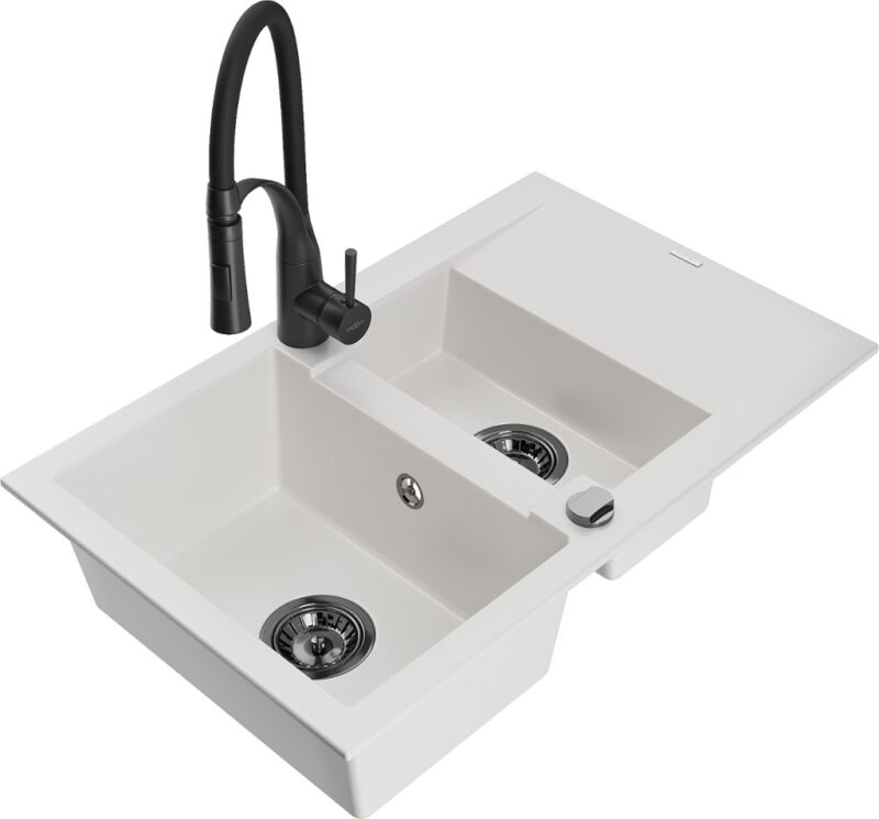 Technické dáta: drez: Rozmer: 737x475x177mm Hĺbka komory: 167 mm (väčšia), 107 mm (menšia) Rozmery komory: 395×272 mm (väčšie), (menšie) 375×182 mm Priemer odtoku: ø90 mm Typ: 1,5-miska s krátkym odkvapkávačom Typ: Zapustené do pracovnej dosky biela farba Povrchová úprava sifónu: čierna Materiál: žula (80% žulové kamenivo, 20% živice) Prepadový otvor: Áno Otvory: (batérie, automatické) 2 Inštalácia: Univerzálna, je možné inštalovať s odkvapkávačom na ľavú alebo pravú stranu Vysoká odolnosť proti poškriabaniu a zmene farby Odolnosť proti tepelným šokom Ľahko čistiteľný povrch kuchynská batéria: Materiál: mosadz Čierna farba Hlava: Keramická Prevzdušňovač: Áno Typ hubica: Flexibilný s mosadzným držiakom Typ: Jedna páka Výška batérie: 430 mm Rozsah výtoku: 235 mm(GT) Ean: 5905315045089