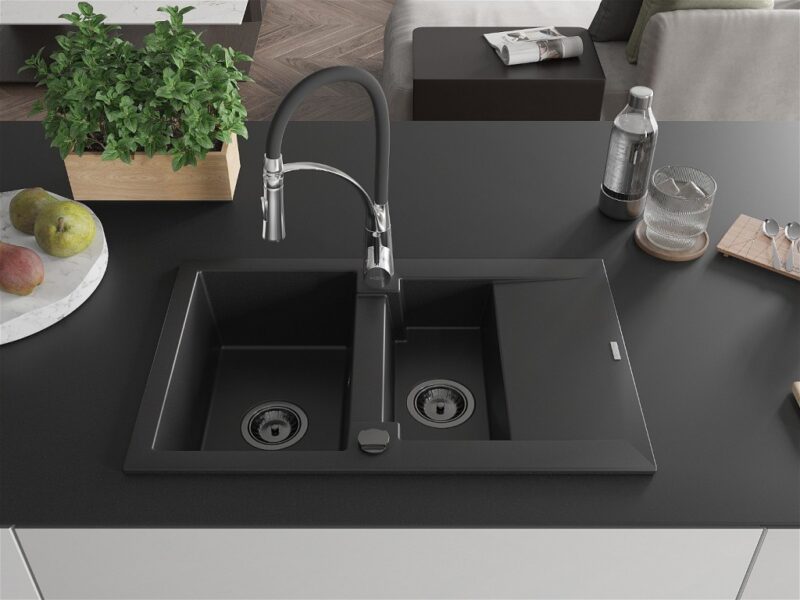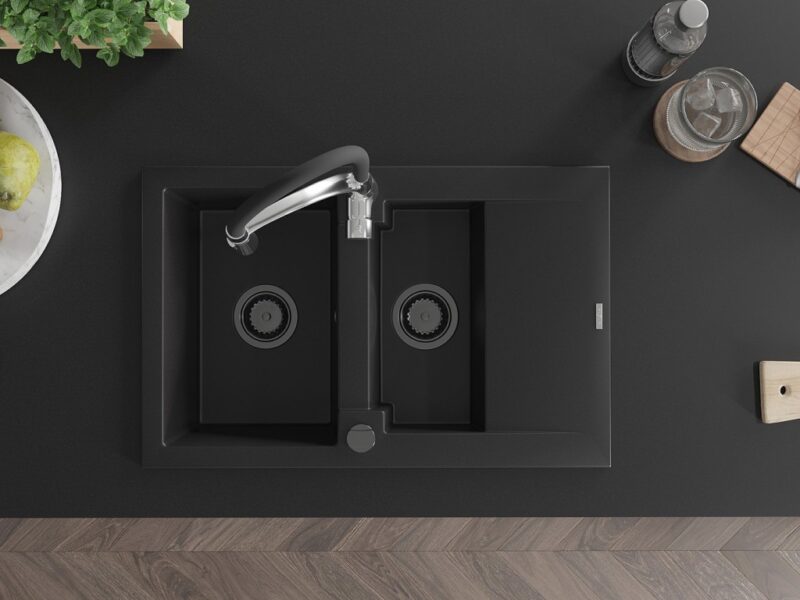 Technické dáta: drez: Rozmer: 737x475x177mm Hĺbka komory: 167 mm (väčšia), 107 mm (menšia) Rozmery komory: 395×272 mm (väčšie), (menšie) 375×182 mm Priemer odtoku: ø90 mm Typ: 1,5-komorový s krátkym odkvapkávačom Typ: Zapustené do pracovnej dosky Čierna farba Povrchová úprava sifónu: čierna Materiál: žula (80% žulové kamenivo, 20% živice) Prepadový otvor: Áno Otvory: (batérie, automatické) 2 Inštalácia: Univerzálna, je možné inštalovať s odkvapkávačom na ľavú alebo pravú stranu Vysoká odolnosť proti poškriabaniu a zmene farby Odolnosť proti tepelným šokom Ľahko čistiteľný povrch kuchynská batéria: Materiál: mosadz Farba: chróm/čierna Hlava: Keramická Prevzdušňovač: Áno Typ: Jedna páka Výška batérie: 430 mm Rozsah výtoku: 185 mm Batéria má výsuvný výtok(GT) Ean: 5905315045416