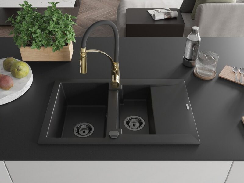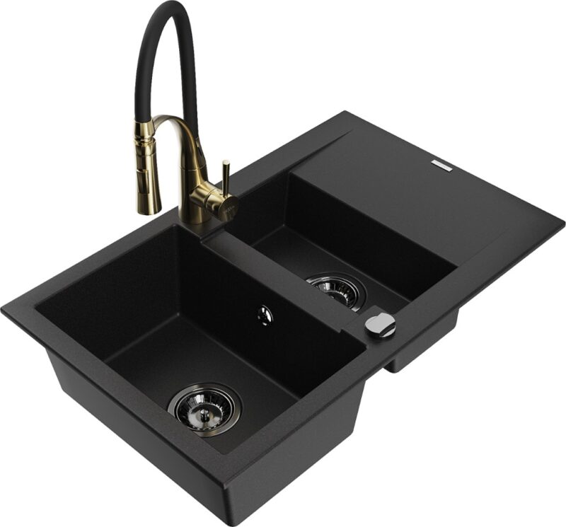Technické dáta: drez: Rozmer: 737x475x177mm Hĺbka komory: 167 mm (väčšia), 107 mm (menšia) Rozmery komory: 395×272 mm (väčšie), (menšie) 375×182 mm Priemer odtoku: ø90 mm Typ: 1,5-komorový s krátkym odkvapkávačom Typ: Zapustené do pracovnej dosky Čierna farba Povrchová úprava sifónu: čierna Materiál: žula (80% žulové kamenivo, 20% živice) Prepadový otvor: Áno Otvory: (batérie, automatické) 2 Inštalácia: Univerzálna, je možné inštalovať s odkvapkávačom na ľavú alebo pravú stranu Vysoká odolnosť proti poškriabaniu a zmene farby Odolnosť proti tepelným šokom Ľahko čistiteľný povrch kuchynská batéria: Materiál: mosadz Farba: Zlatá/Čierna Hlava: Keramická Prevzdušňovač: Áno Typ: Jedna páka Výška batérie: 430 mm Rozsah výtoku: 185 mm Batéria má výsuvný výtok(GT) Ean: 5905315045430