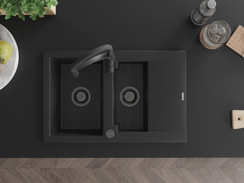 Technické dáta: drez: Rozmer: 737x475x177mm Hĺbka komory: 167 mm (väčšia), 107 mm (menšia) Rozmery komory: 395×272 mm (väčšie), (menšie) 375×182 mm Priemer odtoku: ø90 mm Typ: 1,5-komorový s krátkym odkvapkávačom Typ: Zapustené do pracovnej dosky Čierna farba Povrchová úprava sifónu: čierna Materiál: žula (80% žulové kamenivo, 20% živice) Prepadový otvor: Áno Otvory: (batérie, automatické) 2 Inštalácia: Univerzálna, je možné inštalovať s odkvapkávačom na ľavú alebo pravú stranu Vysoká odolnosť proti poškriabaniu a zmene farby Odolnosť proti tepelným šokom Ľahko čistiteľný povrch kuchynská batéria: Materiál: mosadz Čierna farba Hlava: Keramická Prevzdušňovač: Áno Typ: Jedna páka Výška batérie: 430 mm Rozsah výtoku: 185 mm Batéria má výsuvný výtok(GT) Ean: 5905315045447