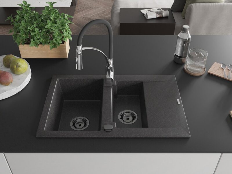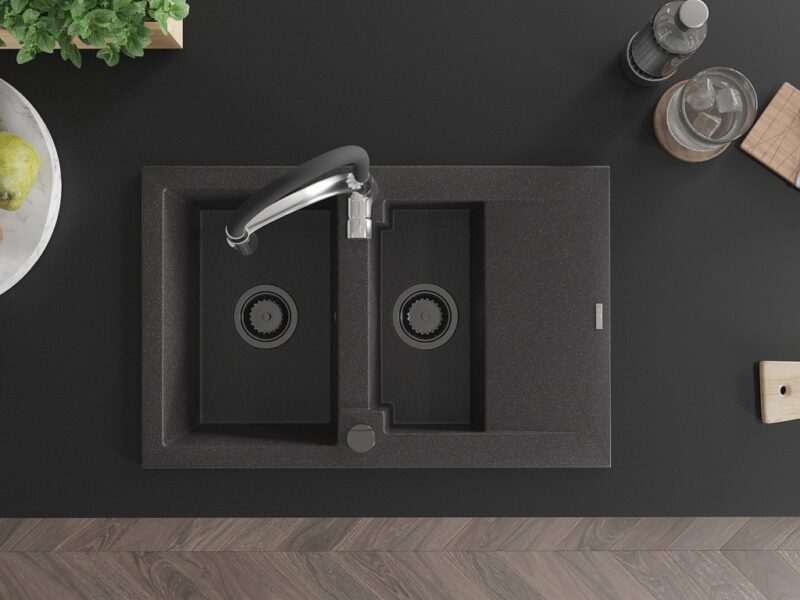 Technické dáta: drez: Rozmer: 737x475x177mm Hĺbka komory: 167 mm (väčšia), 107 mm (menšia) Rozmery komory: 395×272 mm (väčšie), (menšie) 375×182 mm Priemer odtoku: ø90 mm Typ: 1,5-miska s krátkym odkvapkávačom Typ: Zapustené do pracovnej dosky Farba: Škvrnitá čierna Povrchová úprava sifónu: čierna Materiál: žula (80% žulové kamenivo, 20% živice) Prepadový otvor: Áno Otvory: (batérie, automatické) 2 Inštalácia: Univerzálna, je možné inštalovať s odkvapkávačom na ľavú alebo pravú stranu Vysoká odolnosť proti poškriabaniu a zmene farby Odolnosť proti tepelným šokom Ľahko čistiteľný povrch kuchynská batéria: Materiál: mosadz Farba: chróm/čierna Hlava: Keramická Prevzdušňovač: Áno Typ hubica: Flexibilný s mosadzným držiakom Typ: Jedna páka Výška batérie: 430 mm Rozsah výtoku: 235 mm(GT) Ean: 5905315045355