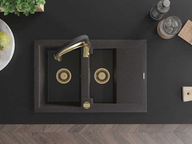 Technické dáta: drez: Rozmer: 737x475x177mm Hĺbka komory: 167 mm (väčšia), 107 mm (menšia) Rozmery komory: 395×272 mm (väčšie), (menšie) 375×182 mm Priemer odtoku: ø90 mm Typ: 1,5-miska s krátkym odkvapkávačom Typ: Zapustené do pracovnej dosky Farba: Škvrnitá čierna Povrchová úprava sifónu: zlatá Materiál: žula (80% žulové kamenivo, 20% živice) Prepadový otvor: Áno Otvory: (batérie, automatické) 2 Inštalácia: Univerzálna, je možné inštalovať s odkvapkávačom na ľavú alebo pravú stranu Vysoká odolnosť proti poškriabaniu a zmene farby Odolnosť proti tepelným šokom Ľahko čistiteľný povrch kuchynská batéria: Materiál: mosadz Farba: Zlatá/Čierna Hlava: Keramická Prevzdušňovač: Áno Typ hubica: Flexibilný s mosadzným držiakom Typ: Jedna páka Výška batérie: 430 mm Rozsah výtoku: 235 mm(GT) Ean: 5905315045362