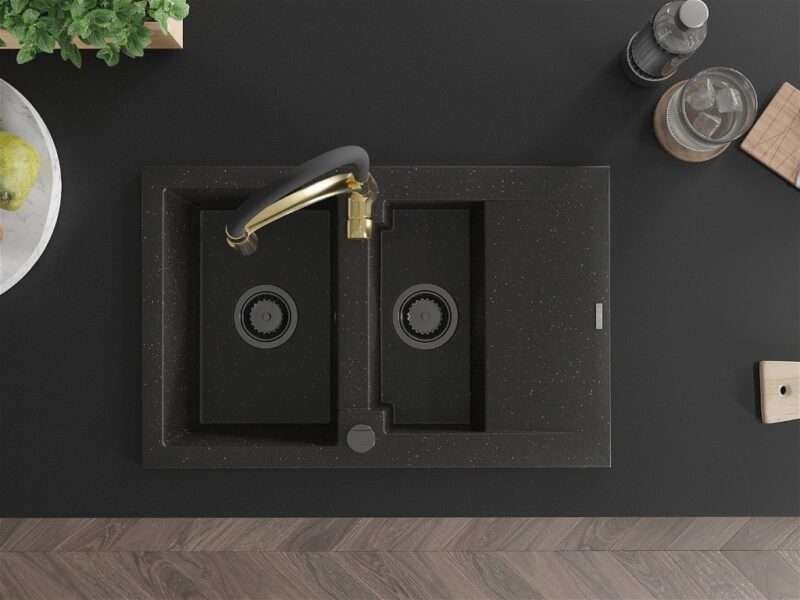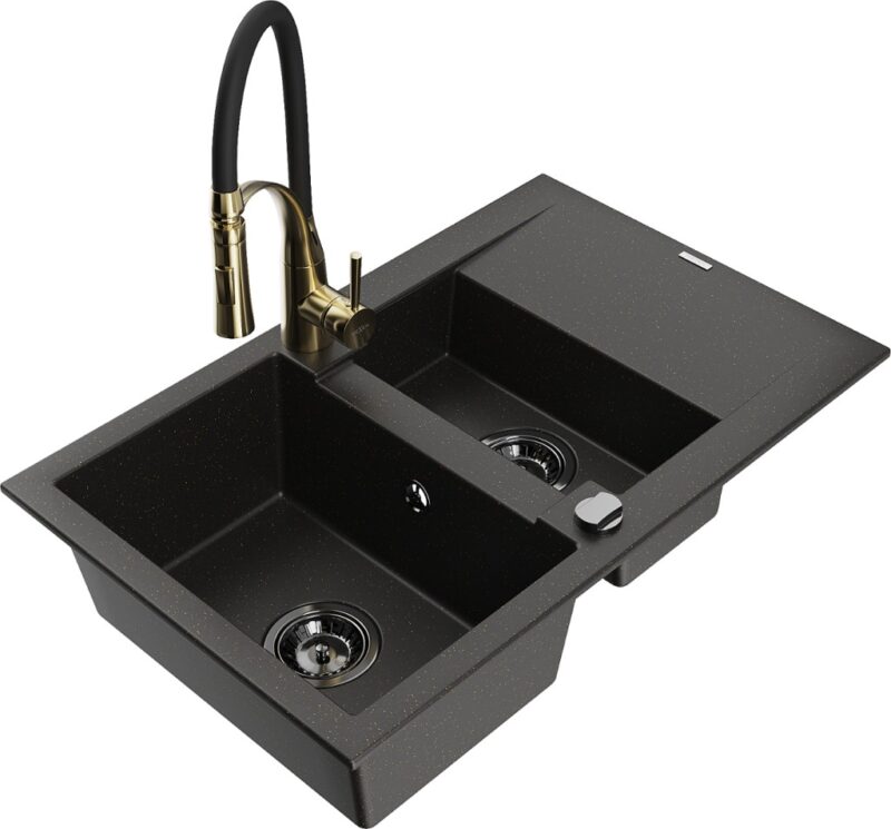 Technické dáta: drez: Rozmer: 737x475x177mm Hĺbka komory: 167 mm (väčšia), 107 mm (menšia) Rozmery komory: 395×272 mm (väčšie), (menšie) 375×182 mm Priemer odtoku: ø90 mm Typ: 1,5-komorový s krátkym odkvapkávačom Typ: Zapustené do pracovnej dosky Farba: čierna / zlatá metalíza Povrchová úprava sifónu: čierna Materiál: žula (80% žulové kamenivo, 20% živice) Prepadový otvor: Áno Otvory: (batérie, automatické) 2 Inštalácia: Univerzálna, je možné inštalovať s odkvapkávačom na ľavú alebo pravú stranu Vysoká odolnosť proti poškriabaniu a zmene farby Odolnosť proti tepelným šokom Ľahko čistiteľný povrch kuchynská batéria: Materiál: mosadz Farba: Zlatá/Čierna Hlava: Keramická Prevzdušňovač: Áno Typ: Jedna páka Výška batérie: 430 mm Rozsah výtoku: 185 mm Batéria má výsuvný výtok(GT) Ean: 5905315045317
