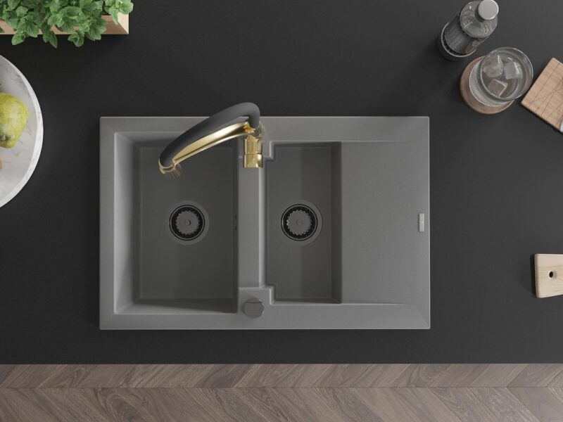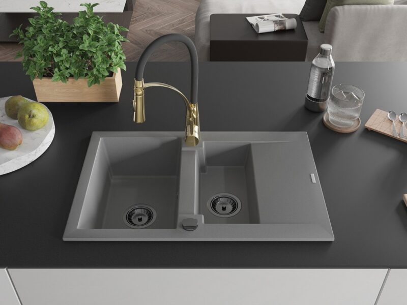 Technické dáta: Drez: Rozmer: 737x475x177 mm Hĺbka komory: 167 mm (väčšia), 107 mm (menšia) Rozmery komory: 395×272 mm (väčšie), (menšie) 375×182 mm Priemer odtoku: ø90 mm Typ: 1,5-miska s krátkym odkvapkávačom Typ: Zapustené do pracovnej dosky Šedá farba Povrchová úprava sifónu: čierna Materiál: žula (80% žulové kamenivo 20% živice) Prepadový otvor: Áno Otvory: (batérie, automat) 2 Inštalácia: Univerzálna, je možné inštalovať s odkvapkávačom na ľavú alebo pravú stranu Vysoká odolnosť proti poškriabaniu a zmene farby Odolnosť proti tepelným šokom Povrch pre ľahké čistenie Kuchynská batéria: Materiál: mosadz Farba: Zlatá/Čierna Hlava: Keramická Perlátor: Áno Typ výtoku: Flexibilný s mosadznou podperou Typ: Jednopáková Výška batérie: 430 mm Rozsah výtoku: 235 mm(GT) Ean: 5905315045195
