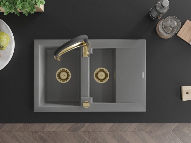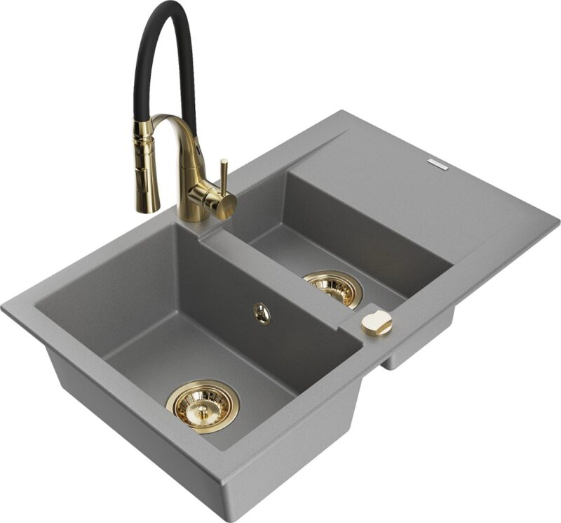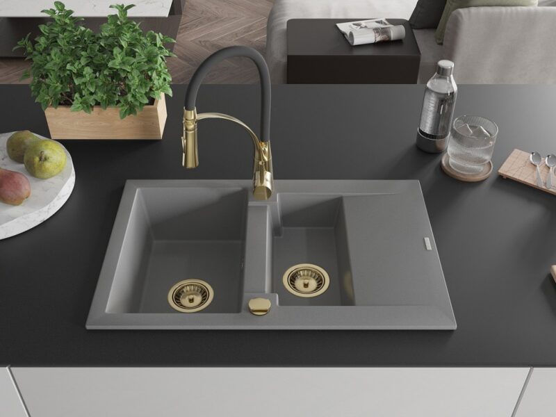 Technické dáta: Drez: Rozmer: 737x475x177 mm Hĺbka komory: 167 mm (väčšia), 107 mm (menšia) Rozmery komory: 395×272 mm (väčšie), (menšie) 375×182 mm Priemer odtoku: ø90 mm Typ: 1,5-miska s krátkym odkvapkávačom Typ: Zapustené do pracovnej dosky Šedá farba Povrchová úprava sifónu: zlatá Materiál: žula (80% žulové kamenivo 20% živice) Prepadový otvor: Áno Otvory: (batérie, automat) 2 Inštalácia: Univerzálna, je možné inštalovať s odkvapkávačom na ľavú alebo pravú stranu Vysoká odolnosť proti poškriabaniu a zmene farby Odolnosť proti tepelným šokom Povrch pre ľahké čistenie Kuchynská batéria: Materiál: mosadz Farba: Zlatá/Čierna Hlava: Keramická Perlátor: Áno Typ výtoku: Flexibilný s mosadznou podperou Typ: Jednopákové Výška batérie: 430 mm Rozsah výtoku: 235 mm(GT) Ean: 5905315045188