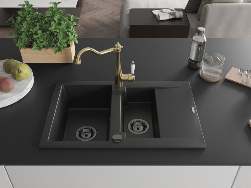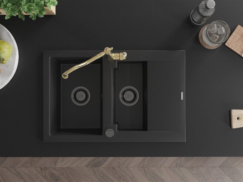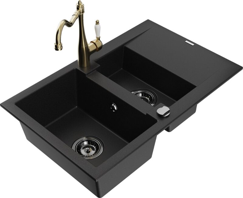 Technické dáta: drez: Rozmer: 737x475x177mm Hĺbka komory: 167 mm (väčšia), 107 mm (menšia) Rozmery komory: 395×272 mm (väčšie), (menšie) 375×182 mm Priemer odtoku: ø90 mm Typ: 1,5-komorový s krátkym odkvapkávačom Typ: Zapustené do pracovnej dosky Čierna farba Povrchová úprava sifónu: čierna Materiál: žula (80% žulové kamenivo, 20% živice) Prepadový otvor: Áno Otvory: (batérie, automatické) 2 Inštalácia: Univerzálna, je možné inštalovať s odkvapkávačom na ľavú alebo pravú stranu Vysoká odolnosť proti poškriabaniu a zmene farby Odolnosť proti tepelným šokom Ľahko čistiteľný povrch kuchynská batéria: Materiál: mosadz Farba: Zlatá Hlava: Keramická Prevzdušňovač: Áno Typ: Jedna páka Výška batérie: 290 mm Rozsah výtoku: 260 mm(GT) Ean: 5905315039590