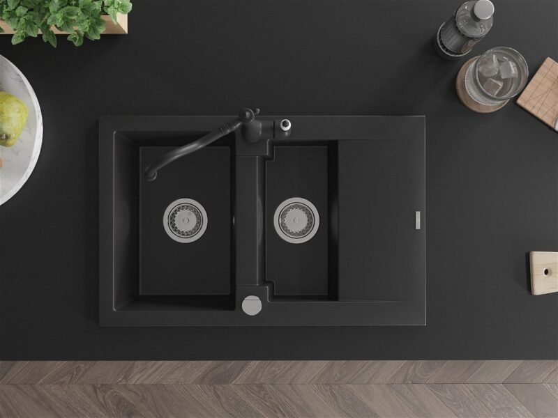 Technické dáta: drez: Rozmer: 737x475x177mm Hĺbka komory: 167 mm (väčšia), 107 mm (menšia) Rozmery komory: 395×272 mm (väčšie), (menšie) 375×182 mm Priemer odtoku: ø90 mm Typ: 1,5-komorový s krátkym odkvapkávačom Typ: Zapustené do pracovnej dosky Čierna farba Povrchová úprava sifónu: Chrome Materiál: žula (80% žulové kamenivo, 20% živice) Prepadový otvor: Áno Otvory: (batérie, automatické) 2 Inštalácia: Univerzálna, je možné inštalovať s odkvapkávačom na ľavú alebo pravú stranu Vysoká odolnosť proti poškriabaniu a zmene farby Odolnosť proti tepelným šokom Ľahko čistiteľný povrch kuchynská batéria: Materiál: mosadz Čierna farba Hlava: Keramická Prevzdušňovač: Áno Typ: Jedna páka Výška batérie: 290 mm Rozsah výtoku: 260 mm(GT) Ean: 5905315039613