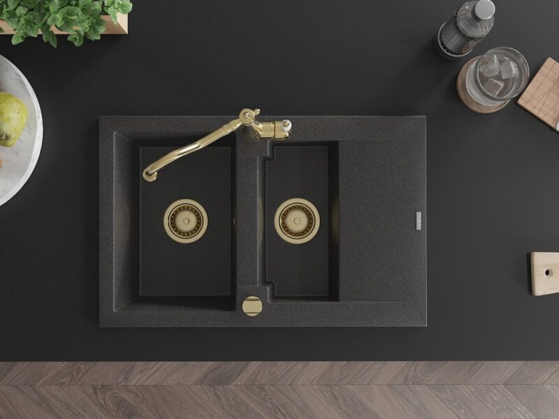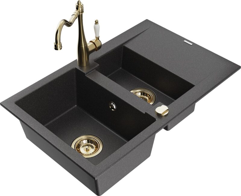 Technické dáta: drez: Rozmer: 737x475x177mm Hĺbka komory: 167 mm (väčšia), 107 mm (menšia) Rozmery komory: 395×272 mm (väčšie), (menšie) 375×182 mm Priemer odtoku: ø90 mm Typ: 1,5-miska s krátkym odkvapkávačom Typ: Zapustené do pracovnej dosky Farba: Škvrnitá čierna Povrchová úprava sifónu: zlatá Materiál: žula (80% žulové kamenivo, 20% živice) Prepadový otvor: Áno Otvory: (batérie, automatické) 2 Inštalácia: Univerzálna, je možné inštalovať s odkvapkávačom na ľavú alebo pravú stranu Vysoká odolnosť proti poškriabaniu a zmene farby Odolnosť proti tepelným šokom Ľahko čistiteľný povrch kuchynská batéria: Materiál: mosadz Farba: Zlatá Hlava: Keramická Prevzdušňovač: Áno Typ: Jedna páka Výška batérie: 290 mm Rozsah výtoku: 260 mm(GT) Ean: 5905315039538