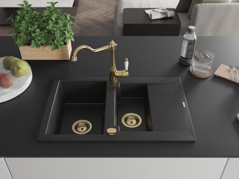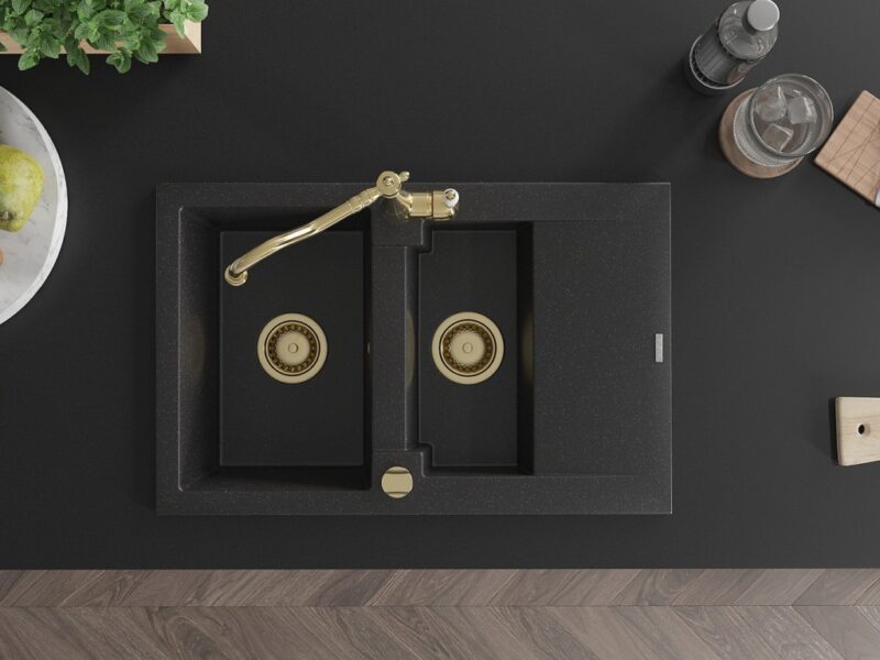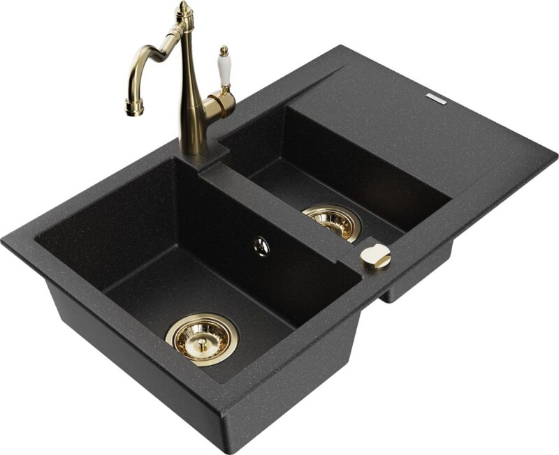 Technické dáta: drez: Rozmer: 737x475x177mm Hĺbka komory: 167 mm (väčšia), 107 mm (menšia) Rozmery komory: 395×272 mm (väčšie), (menšie) 375×182 mm Priemer odtoku: ø90 mm Typ: 1,5-komorový s krátkym odkvapkávačom Typ: Zapustené do pracovnej dosky Farba: čierna/strieborná metalíza Povrchová úprava sifónu: zlatá Materiál: žula (80% žulové kamenivo, 20% živice) Prepadový otvor: Áno Otvory: (batérie, automatické) 2 Inštalácia: Univerzálna, je možné inštalovať s odkvapkávačom na ľavú alebo pravú stranu Vysoká odolnosť proti poškriabaniu a zmene farby Odolnosť proti tepelným šokom Ľahko čistiteľný povrch kuchynská batéria: Materiál: mosadz Farba: Zlatá Hlava: Keramická Prevzdušňovač: Áno Typ: Jedna páka Výška batérie: 290 mm Rozsah výtoku: 260 mm(GT) Ean: 5905315039446