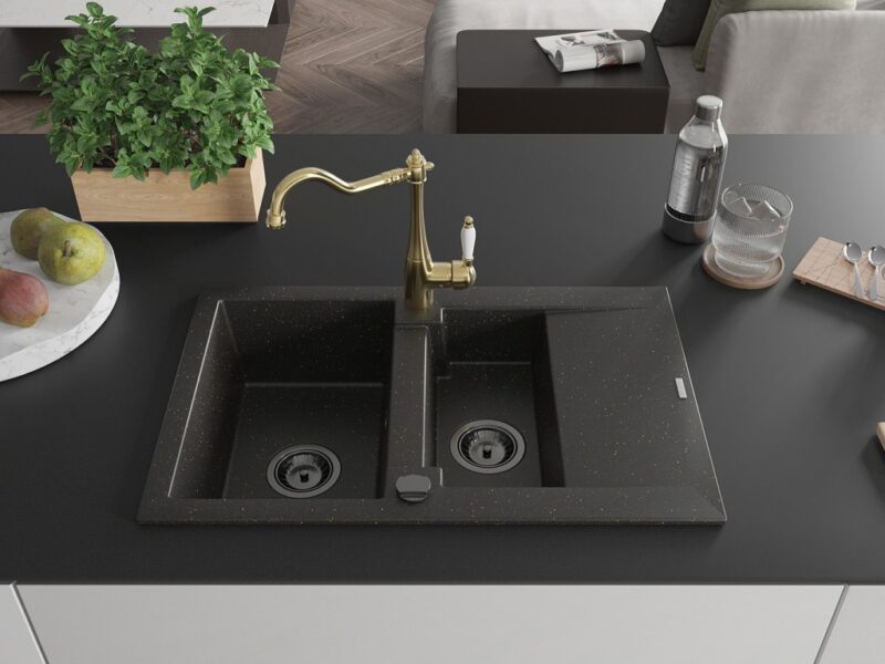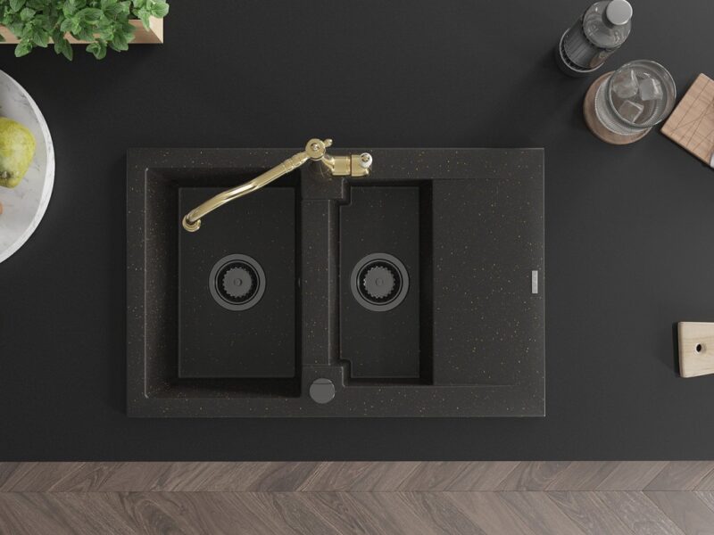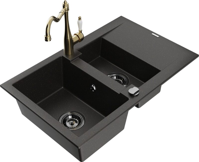 Technické dáta: drez: Rozmer: 737x475x177mm Hĺbka komory: 167 mm (väčšia), 107 mm (menšia) Rozmery komory: 395×272 mm (väčšie), (menšie) 375×182 mm Priemer odtoku: ø90 mm Typ: 1,5-komorový s krátkym odkvapkávačom Typ: Zapustené do pracovnej dosky Farba: čierna / zlatá metalíza Povrchová úprava sifónu: čierna Materiál: žula (80% žulové kamenivo, 20% živice) Prepadový otvor: Áno Otvory: (batérie, automatické) 2 Inštalácia: Univerzálna, je možné inštalovať s odkvapkávačom na ľavú alebo pravú stranu Vysoká odolnosť proti poškriabaniu a zmene farby Odolnosť proti tepelným šokom Ľahko čistiteľný povrch kuchynská batéria: Materiál: mosadz Farba: Zlatá Hlava: Keramická Prevzdušňovač: Áno Typ: Jedna páka Výška batérie: 290 mm Rozsah výtoku: 260 mm(GT) Ean: 5905315039491