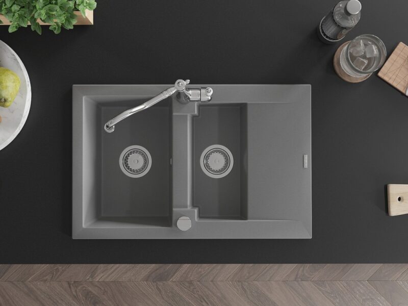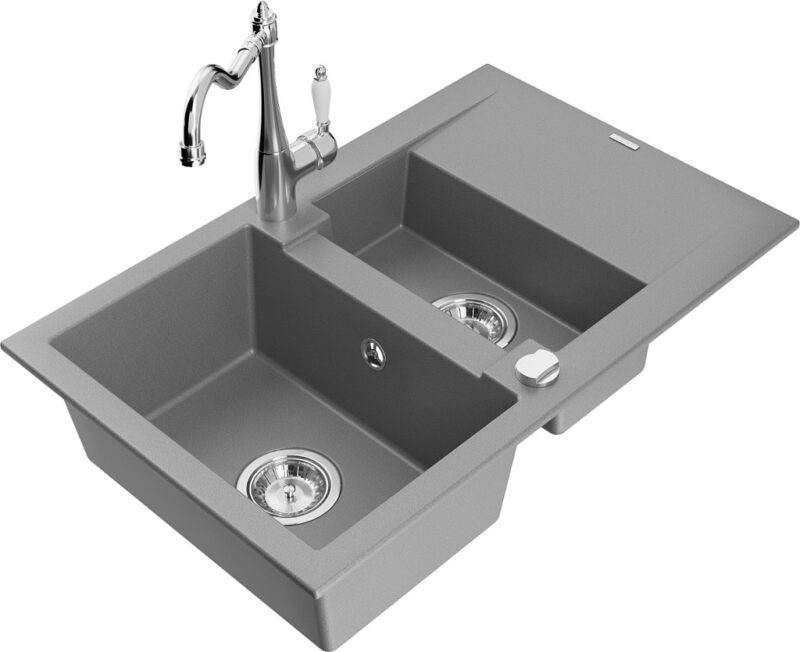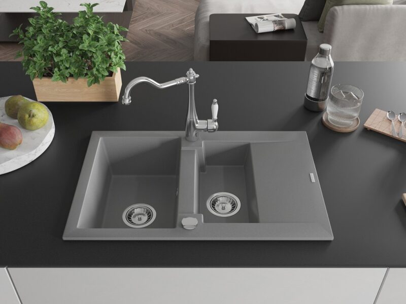 Technické dáta: Drez: Rozmer: 737x475x177 mm Hĺbka komory: 167 mm (väčšia), 107 mm (menšia) Rozmery komory: 395×272 mm (väčšie), (menšie) 375×182 mm Priemer odtoku: ø90 mm Typ: 1,5-miska s krátkym odkvapkávačom Typ: Zapustené do pracovnej dosky Šedá farba Povrchová úprava sifónu: Chrome Materiál: žula (80% žulové kamenivo 20% živice) Prepadový otvor: Áno Otvory: (batérie, automat) 2 Inštalácia: Univerzálna, je možné inštalovať s odkvapkávačom na ľavú alebo pravú stranu Vysoká odolnosť proti poškriabaniu a zmene farby Odolnosť proti tepelným šokom Povrch pre ľahké čistenie Kuchynská batéria: Materiál: mosadz Farba: Chrome Hlava: Keramická Perlátor: Áno Typ: Jednopákové Výška batérie: 290 mm Rozsah výtoku: 260 mm(GT) Ean: 5905315039385