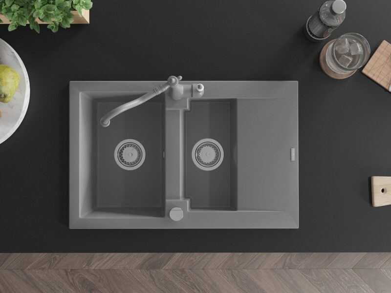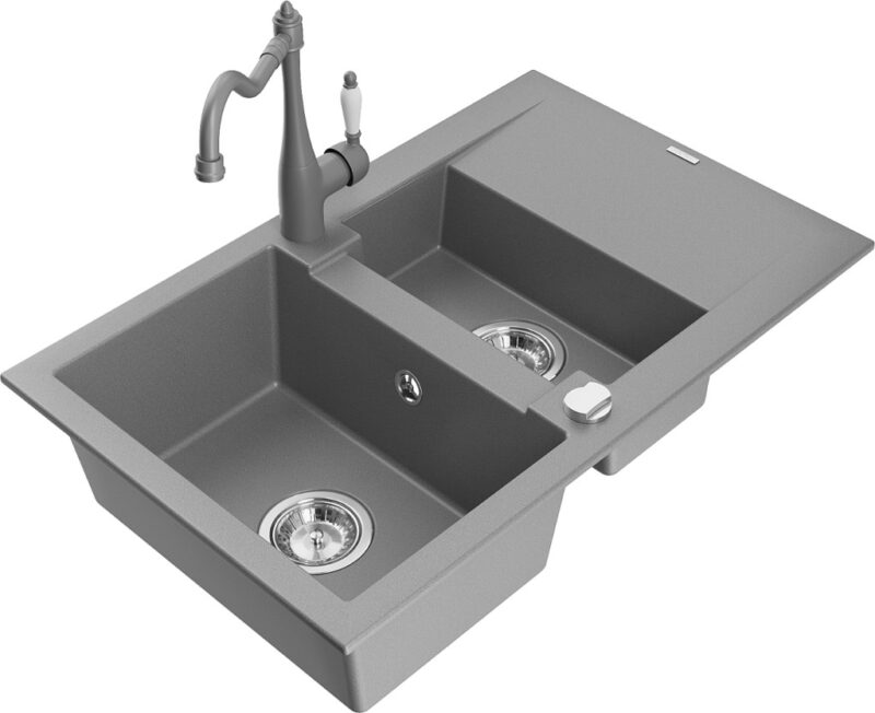 Technické dáta: Drez: Rozmer: 737x475x177 mm Hĺbka komory: 167 mm (väčšia), 107 mm (menšia) Rozmery komory: 395×272 mm (väčšie), (menšie) 375×182 mm Priemer odtoku: ø90 mm Typ: 1,5-miska s krátkym odkvapkávačom Typ: Zapustené do pracovnej dosky Šedá farba Povrchová úprava sifónu: Chrome Materiál: žula (80% žulové kamenivo 20% živice) Prepadový otvor: Áno Otvory: (batérie, automat) 2 Inštalácia: Univerzálna, je možné inštalovať s odkvapkávačom na ľavú alebo pravú stranu Vysoká odolnosť proti poškriabaniu a zmene farby Odolnosť proti tepelným šokom Povrch pre ľahké čistenie Kuchynská batéria: Materiál: mosadz Šedá farba Hlava: Keramická Perlátor: Áno Typ: Jednopáková Výška batérie: 290 mm Rozsah výtoku: 260 mm(GT) Ean: 5905315039422