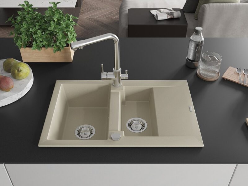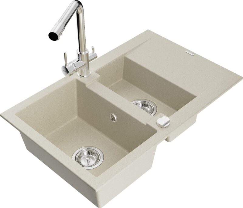Technické dáta: Drez: Rozmer: 737x475x177 mm Hĺbka komory: 167 mm (väčšia), 107 mm (menšia) Rozmery komory: 395×272 mm (väčšie), (menšie) 375×182 mm Priemer odtoku: ø90 mm Typ: 1,5-miska s krátkym odkvapkávačom Typ: Zapustené do pracovnej dosky Farba béžová Povrchová úprava sifónu: Chrome Materiál: žula (80% žulové kamenivo 20% živice) Prepadový otvor: Áno Otvory: (batérie, automat) 2 Inštalácia: Univerzálna, je možné inštalovať s odkvapkávačom na ľavú alebo pravú stranu Vysoká odolnosť proti poškriabaniu a zmene farby Odolnosť proti tepelným šokom Povrch pre ľahké čistenie Kuchynská batéria: Materiál: mosadz Farba: Chrome Hlava: Keramická Perlátor: Áno Typ: Dve rukoväte Rozsah výtoku: 235 mm Výška batérie: 315 mm Dvojhlavá batéria s prídavným filtrom na pitnú vodu(GT) Ean: 5905315023971