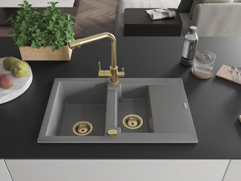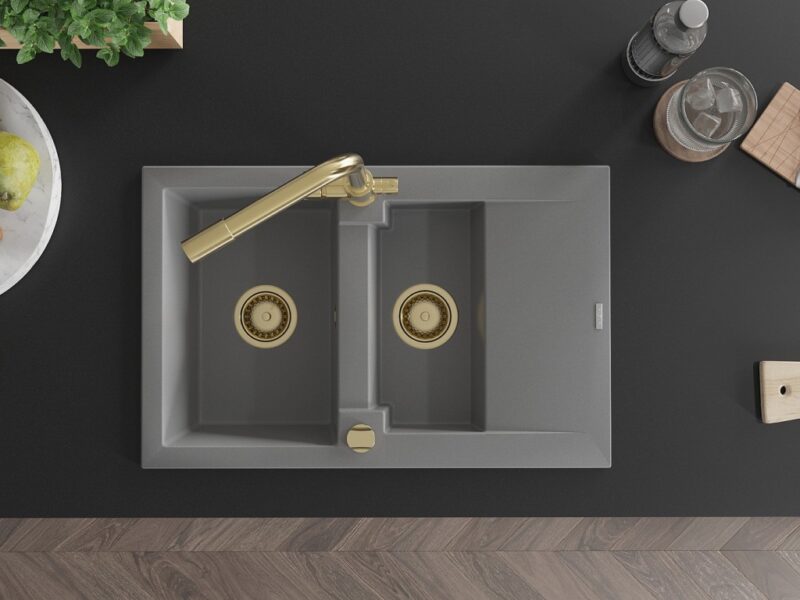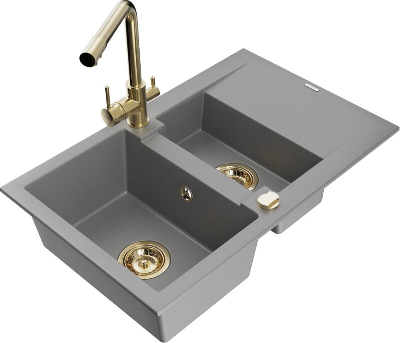 Technické dáta: Drez: Rozmer: 737x475x177 mm Hĺbka komory: 167 mm (väčšia), 107 mm (menšia) Rozmery komory: 395×272 mm (väčšie), (menšie) 375×182 mm Priemer odtoku: ø90 mm Typ: 1,5-miska s krátkym odkvapkávačom Typ: Zapustené do pracovnej dosky Šedá farba Povrchová úprava sifónu: zlatá Materiál: žula (80% žulové kamenivo 20% živice) Prepadový otvor: Áno Otvory: (batérie, automat) 2 Inštalácia: Univerzálna, je možné inštalovať s odkvapkávačom na ľavú alebo pravú stranu Vysoká odolnosť proti poškriabaniu a zmene farby Odolnosť proti tepelným šokom Povrch pre ľahké čistenie Kuchynská batéria: Materiál: mosadz Farba: Zlatá Hlava: Keramická Perlátor: Áno Typ: Dve rukoväte Rozsah výtoku: 235 mm Výška batérie: 315 mm Dvojhlavá batéria s prídavným filtrom na pitnú vodu(GT) Ean: 5905315024022