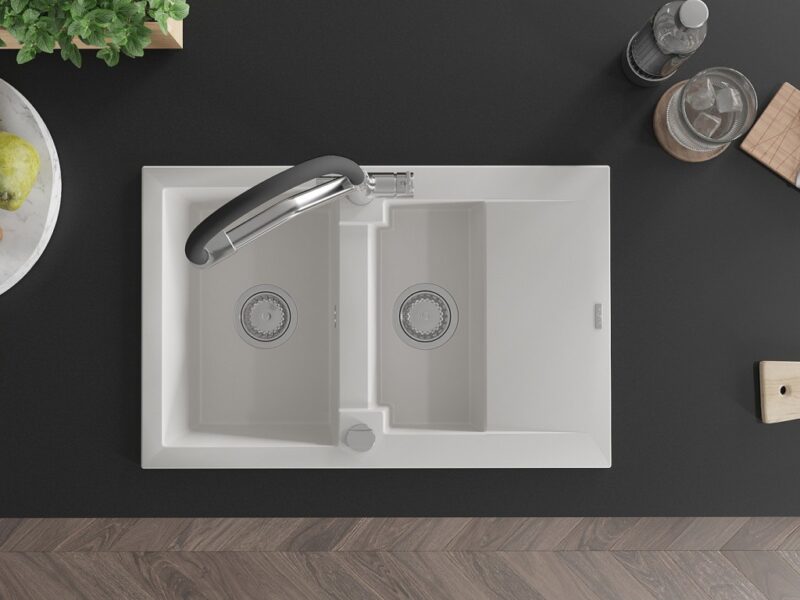 Technické dáta: drez: Rozmer: 737x475x177mm Hĺbka komory: 167 mm (väčšia), 107 mm (menšia) Rozmery komory: 395×272 mm (väčšie), (menšie) 375×182 mm Priemer odtoku: ø90 mm Typ: 1,5-miska s krátkym odkvapkávačom Typ: Zapustené do pracovnej dosky biela farba Povrchová úprava sifónu: Chrome Materiál: žula (80% žulové kamenivo, 20% živice) Prepadový otvor: Áno Otvory: (batérie, automatické) 2 Inštalácia: Univerzálna, je možné inštalovať s odkvapkávačom na ľavú alebo pravú stranu Vysoká odolnosť proti poškriabaniu a zmene farby Odolnosť proti tepelným šokom Ľahko čistiteľný povrch kuchynská batéria: Materiál: mosadz Farba: chróm/čierna Hlavy: Keramické Prevzdušňovač: Áno Typ hubica: Flexibilný s mosadzným držiakom Rozsah výtoku: 260 mm Výška: 405 mm Typ: Dve rukoväte Dvojhlavá batéria s prídavným filtrom na pitnú vodu(GT) Ean: 5905315100450
