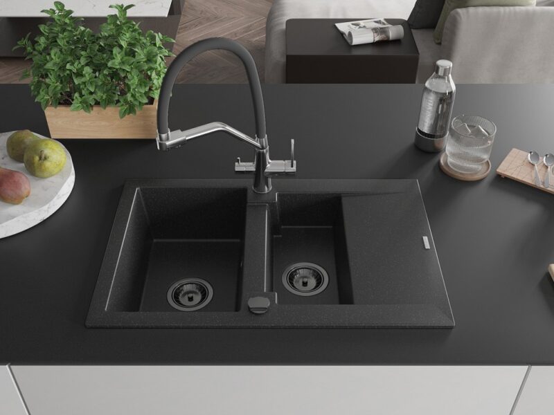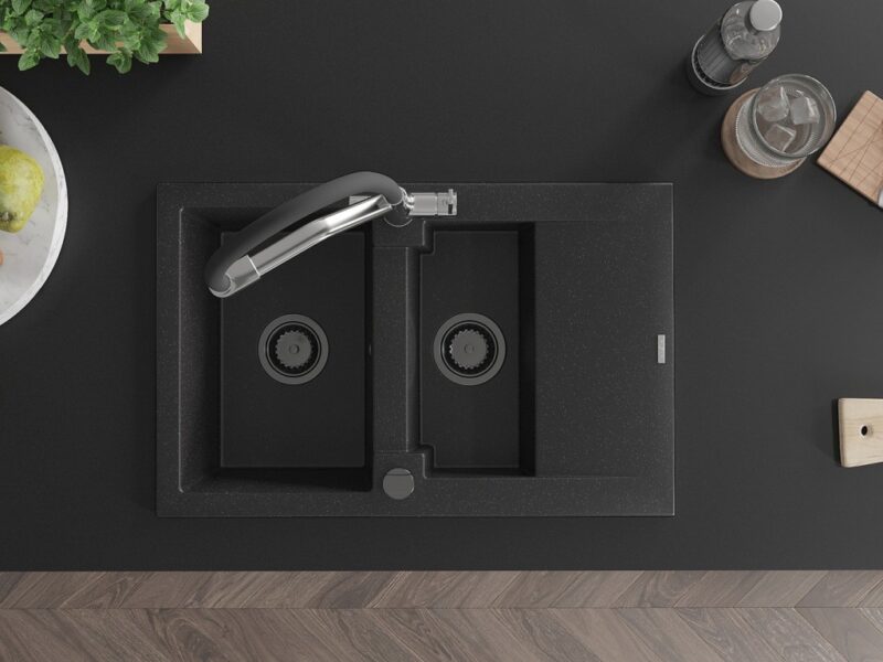 Technické dáta: drez: Rozmer: 737x475x177mm Hĺbka komory: 167 mm (väčšia), 107 mm (menšia) Rozmery komory: 395×272 mm (väčšie), (menšie) 375×182 mm Priemer odtoku: ø90 mm Typ: 1,5-miska s krátkym odkvapkávačom Typ: Zapustené do pracovnej dosky Farba: čierna/strieborná metalíza Povrchová úprava sifónu: čierna Materiál: žula (80% žulové kamenivo, 20% živice) Prepadový otvor: Áno Otvory: (batérie, automatické) 2 Inštalácia: Univerzálna, je možné inštalovať s odkvapkávačom na ľavú alebo pravú stranu Vysoká odolnosť proti poškriabaniu a zmene farby Odolnosť proti tepelným šokom Ľahko čistiteľný povrch kuchynská batéria: Materiál: mosadz Farba: chróm/čierna Hlavy: Keramické Prevzdušňovač: Áno Typ hubica: Flexibilný s mosadzným držiakom Rozsah výtoku: 260 mm Výška: 405 mm Typ: Dve rukoväte Dvojhlavá batéria s prídavným filtrom na pitnú vodu(GT) Ean: 5905315100610