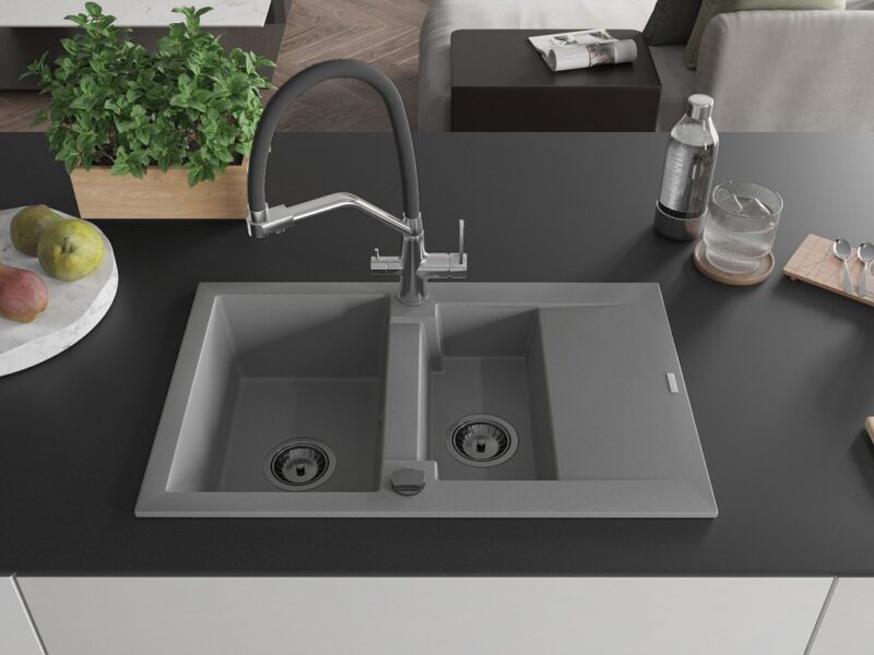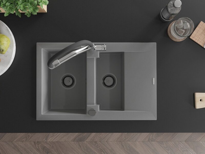 Technické dáta: Drez: Rozmer: 737x475x177 mm Hĺbka komory: 167 mm (väčšia), 107 mm (menšia) Rozmery komory: 395×272 mm (väčšie), (menšie) 375×182 mm Priemer odtoku: ø90 mm Typ: 1,5-miska s krátkym odkvapkávačom Typ: Zapustené do pracovnej dosky Šedá farba Povrchová úprava sifónu: čierna Materiál: žula (80% žulové kamenivo 20% živice) Prepadový otvor: Áno Otvory: (batérie, automat) 2 Inštalácia: Univerzálna, je možné inštalovať s odkvapkávačom na ľavú alebo pravú stranu Vysoká odolnosť proti poškriabaniu a zmene farby Odolnosť proti tepelným šokom Povrch pre ľahké čistenie Kuchynská batéria: Materiál: mosadz Farba: chróm/čierna Hlavy: Keramické Perlátor: Áno Typ výtoku: Flexibilný s mosadznou podperou Rozsah výtoku: 260 mm Výška: 405 mm Typ: Dve rukoväte Dvojhlavá batéria s prídavným filtrom na pitnú vodu(GT) Ean: 5905315100566