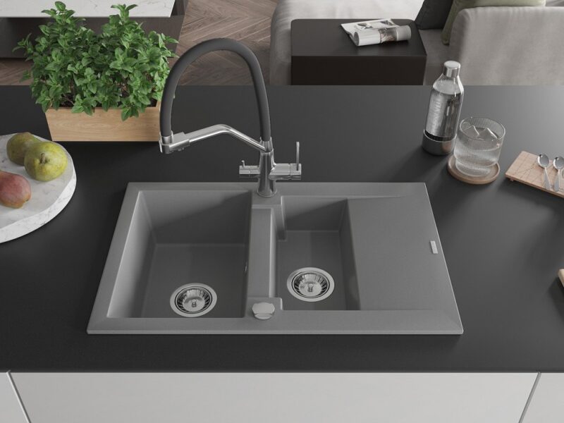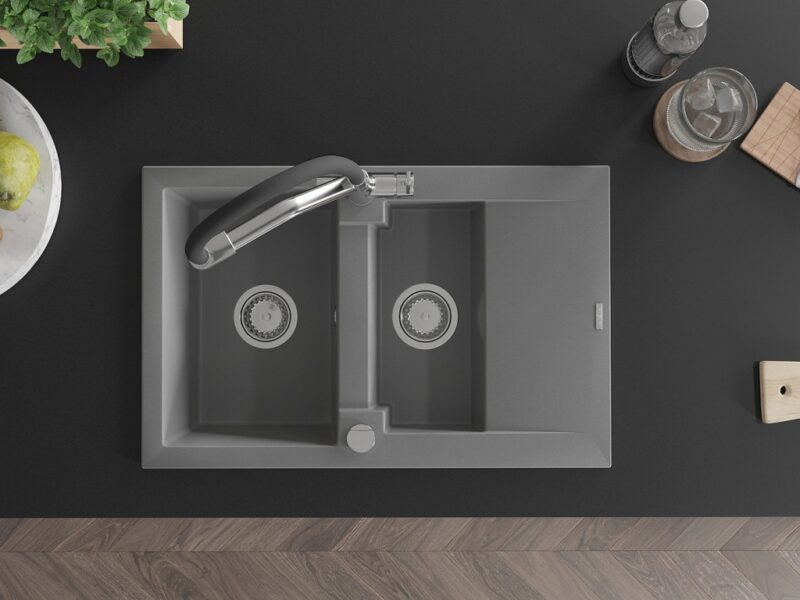 Technické dáta: Drez: Rozmer: 737x475x177 mm Hĺbka komory: 167 mm (väčšia), 107 mm (menšia) Rozmery komory: 395×272 mm (väčšie), (menšie) 375×182 mm Priemer odtoku: ø90 mm Typ: 1,5-miska s krátkym odkvapkávačom Typ: Zapustené do pracovnej dosky Šedá farba Povrchová úprava sifónu: Chrome Materiál: žula (80% žulové kamenivo 20% živice) Prepadový otvor: Áno Otvory: (batérie, automat) 2 Inštalácia: Univerzálna, je možné inštalovať s odkvapkávačom na ľavú alebo pravú stranu Vysoká odolnosť proti poškriabaniu a zmene farby Odolnosť proti tepelným šokom Povrch pre ľahké čistenie Kuchynská batéria: Materiál: mosadz Farba: chróm/čierna Hlavy: Keramické Perlátor: Áno Typ výtoku: Flexibilný s mosadzným držiakom Rozsah výtoku: 260 mm Výška: 405 mm Typ: Dve rukoväte Dvojhlavá batéria s prídavným filtrom na pitnú vodu(GT) Ean: 5905315100559