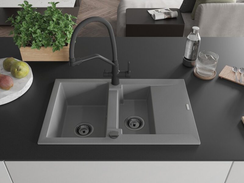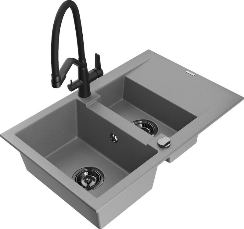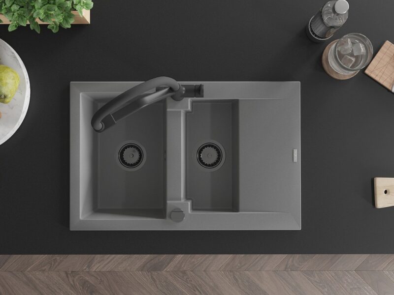 Technické dáta: Drez: Rozmer: 737x475x177 mm Hĺbka komory: 167 mm (väčšia), 107 mm (menšia) Rozmery komory: 395×272 mm (väčšie), (menšie) 375×182 mm Priemer odtoku: ø90 mm Typ: 1,5-miska s krátkym odkvapkávačom Typ: Zapustené do pracovnej dosky Šedá farba Povrchová úprava sifónu: čierna Materiál: žula (80% žulové kamenivo 20% živice) Prepadový otvor: Áno Otvory: (batérie, automat) 2 Inštalácia: Univerzálna, je možné inštalovať s odkvapkávačom na ľavú alebo pravú stranu Vysoká odolnosť proti poškriabaniu a zmene farby Odolnosť proti tepelným šokom Povrch pre ľahké čistenie Kuchynská batéria: Materiál: mosadz Čierna farba Hlavy: Keramické Perlátor: Áno Typ výtoku: Flexibilný s mosadzným držiakom Rozsah výtoku: 260 mm Výška: 405 mm Typ: Dve rukoväte Dvojhlavá batéria s prídavným filtrom na pitnú vodu(GT) Ean: 5905315100597