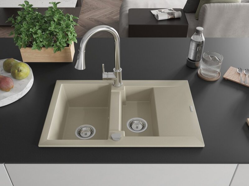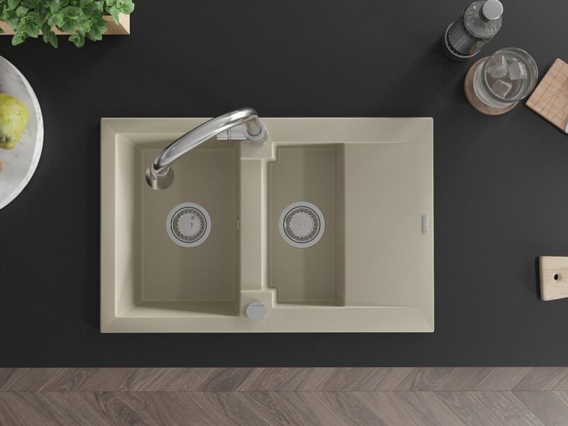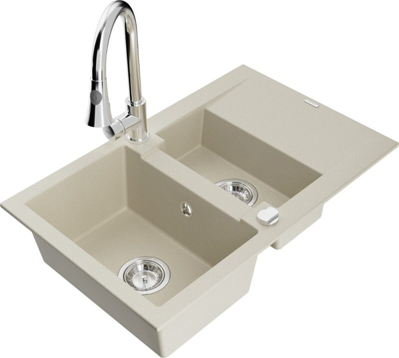 Technické dáta: Drez: Rozmer: 737x475x177 mm Hĺbka komory: 167 mm (väčšia), 107 mm (menšia) Rozmery komory: 395×272 mm (väčšie), (menšie) 375×182 mm Priemer odtoku: ø90 mm Typ: 1,5-miska s krátkym odkvapkávačom Typ: Zapustené do pracovnej dosky Farba béžová Povrchová úprava sifónu: Chrome Materiál: žula (80% žulové kamenivo 20% živice) Prepadový otvor: Áno Otvory: (batérie, automat) 2 Inštalácia: Univerzálna, je možné inštalovať s odkvapkávačom na ľavú alebo pravú stranu Vysoká odolnosť proti poškriabaniu a zmene farby Odolnosť proti tepelným šokom Povrch pre ľahké čistenie Kuchynská batéria: Materiál: mosadz Farba: Chrome Hlava: Keramická Perlátor: Áno Typ: Jednopákové Výška batérie: 380 mm Rozsah výtoku: 252 mm Typ výtoku: Výsuvný(GT) Ean: 5905315029096