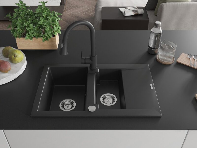 Technické dáta: drez: Rozmer: 737x475x177mm Hĺbka komory: 167 mm (väčšia), 107 mm (menšia) Rozmery komory: 395×272 mm (väčšie), (menšie) 375×182 mm Priemer odtoku: ø90 mm Typ: 1,5-miska s krátkym odkvapkávačom Typ: Zapustené do pracovnej dosky Čierna farba Povrchová úprava sifónu: Chrome Materiál: žula (80% žulové kamenivo, 20% živice) Prepadový otvor: Áno Otvory: (batérie, automatické) 2 Inštalácia: Univerzálna, je možné inštalovať s odkvapkávačom na ľavú alebo pravú stranu Vysoká odolnosť proti poškriabaniu a zmene farby Odolnosť proti tepelným šokom Ľahko čistiteľný povrch kuchynská batéria: Materiál: mosadz Čierna farba Hlava: Keramická Prevzdušňovač: Áno Typ: Jedna páka Výška batérie: 380 mm Rozsah výtoku: 252 mm Typ výtoku: Výsuvný(GT) Ean: 5905315029362