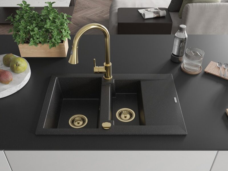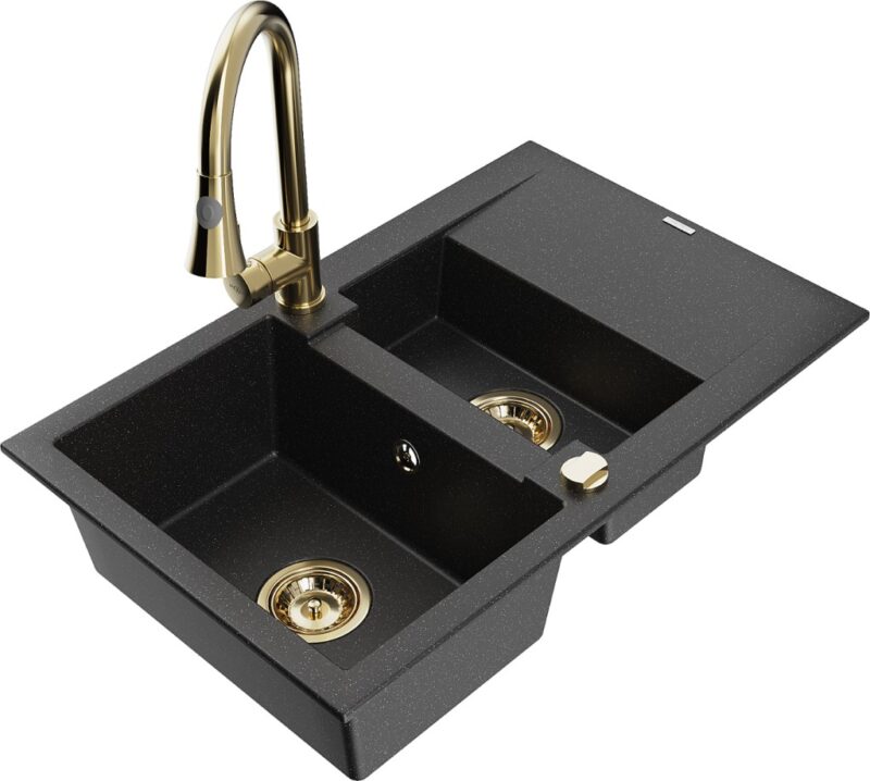 Technické dáta: drez: Rozmer: 737x475x177mm Hĺbka komory: 167 mm (väčšia), 107 mm (menšia) Rozmery komory: 395×272 mm (väčšie), (menšie) 375×182 mm Priemer odtoku: ø90 mm Typ: 1,5-miska s krátkym odkvapkávačom Typ: Zapustené do pracovnej dosky Farba: čierna/strieborná metalíza Povrchová úprava sifónu: zlatá Materiál: žula (80% žulové kamenivo, 20% živice) Prepadový otvor: Áno Otvory: (batérie, automatické) 2 Inštalácia: Univerzálna, je možné inštalovať s odkvapkávačom na ľavú alebo pravú stranu Vysoká odolnosť proti poškriabaniu a zmene farby Odolnosť proti tepelným šokom Ľahko čistiteľný povrch kuchynská batéria: Materiál: mosadz Farba: Zlatá Hlava: Keramická Prevzdušňovač: Áno Typ: Jedna páka Výška batérie: 380 mm Rozsah výtoku: 252 mm Typ výtoku: Výsuvný(GT) Ean: 5905315029195