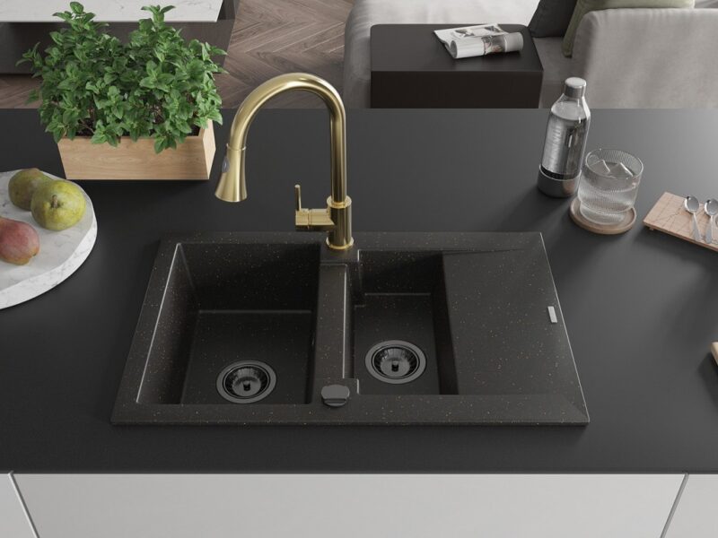Technické dáta: drez: Rozmer: 737x475x177mm Hĺbka komory: 167 mm (väčšia), 107 mm (menšia) Rozmery komory: 395×272 mm (väčšie), (menšie) 375×182 mm Priemer odtoku: ø90 mm Typ: 1,5-miska s krátkym odkvapkávačom Typ: Zapustené do pracovnej dosky Farba: čierna / zlatá metalíza Povrchová úprava sifónu: čierna Materiál: žula (80% žulové kamenivo, 20% živice) Prepadový otvor: Áno Otvory: (batérie, automatické) 2 Inštalácia: Univerzálna, je možné inštalovať s odkvapkávačom na ľavú alebo pravú stranu Vysoká odolnosť proti poškriabaniu a zmene farby Odolnosť proti tepelným šokom Ľahko čistiteľný povrch kuchynská batéria: Materiál: mosadz Farba: Zlatá Hlava: Keramická Prevzdušňovač: Áno Typ: Jedna páka Výška batérie: 380 mm Rozsah výtoku: 252 mm Typ výtoku: Výsuvný(GT) Ean: 5905315029249
