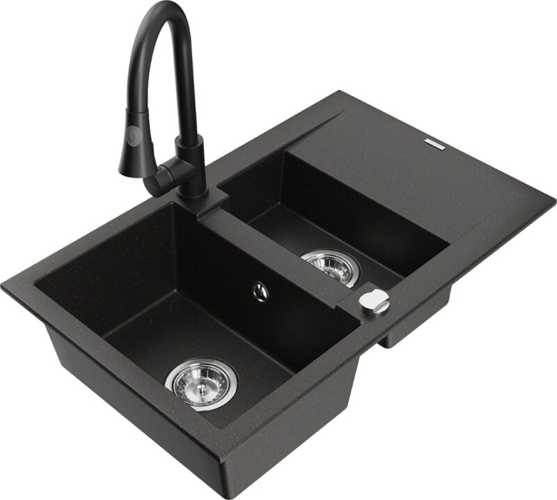 Technické dáta: drez: Rozmer: 737x475x177mm Hĺbka komory: 167 mm (väčšia), 107 mm (menšia) Rozmery komory: 395×272 mm (väčšie), (menšie) 375×182 mm Priemer odtoku: ø90 mm Typ: 1,5-miska s krátkym odkvapkávačom Typ: Zapustené do pracovnej dosky Farba: čierna / zlatá metalíza Povrchová úprava sifónu: Chrome Materiál: žula (80% žulové kamenivo, 20% živice) Prepadový otvor: Áno Otvory: (batérie, automatické) 2 Inštalácia: Univerzálna, je možné inštalovať s odkvapkávačom na ľavú alebo pravú stranu Vysoká odolnosť proti poškriabaniu a zmene farby Odolnosť proti tepelným šokom Ľahko čistiteľný povrch kuchynská batéria: Materiál: mosadz Čierna farba Hlava: Keramická Prevzdušňovač: Áno Typ: Jedna páka Výška batérie: 380 mm Rozsah výtoku: 252 mm Typ výtoku: Výsuvný(GT) Ean: 5905315029256