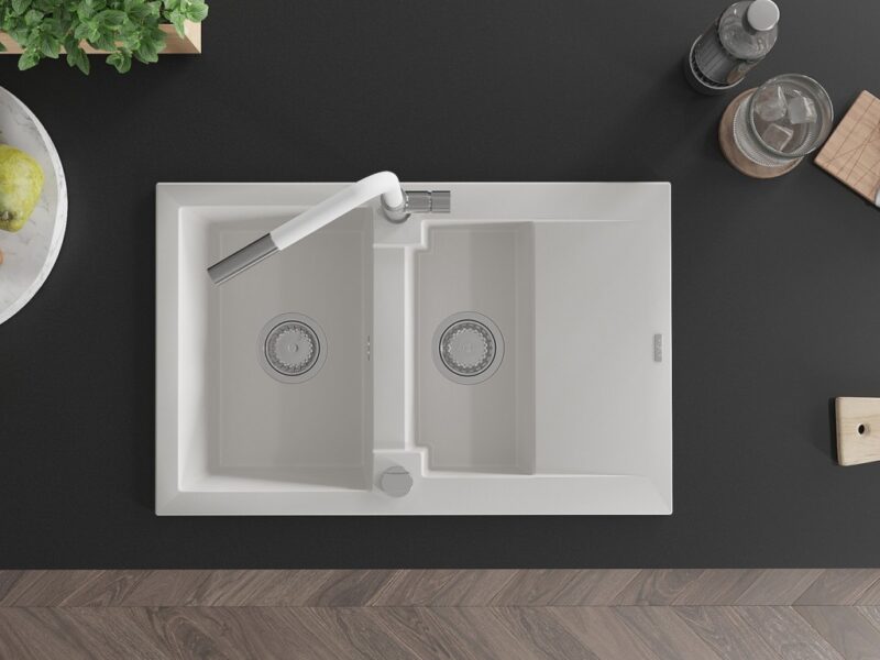 Technické dáta: drez: Rozmer: 737x475x177mm Hĺbka komory: 167 mm (väčšia), 107 mm (menšia) Rozmery komory: 395×272 mm (väčšie), (menšie) 375×182 mm Priemer odtoku: ø90 mm Typ: 1,5-miska s krátkym odkvapkávačom Typ: Zapustené do pracovnej dosky biela farba Povrchová úprava sifónu: Chrome Materiál: žula (80% žulové kamenivo, 20% živice) Prepadový otvor: Áno Otvory: (batérie, automatické) 2 Inštalácia: Univerzálna, je možné inštalovať s odkvapkávačom na ľavú alebo pravú stranu Vysoká odolnosť proti poškriabaniu a zmene farby Odolnosť proti tepelným šokom Ľahko čistiteľný povrch kuchynská batéria: Materiál: mosadz Farba: chróm/biela Hlava: Keramická Prevzdušňovač: Áno Typ: Jedna páka Rozsah výtoku: 245 mm Výška batérie: 307 mm(GT) Ean: 5905315058966